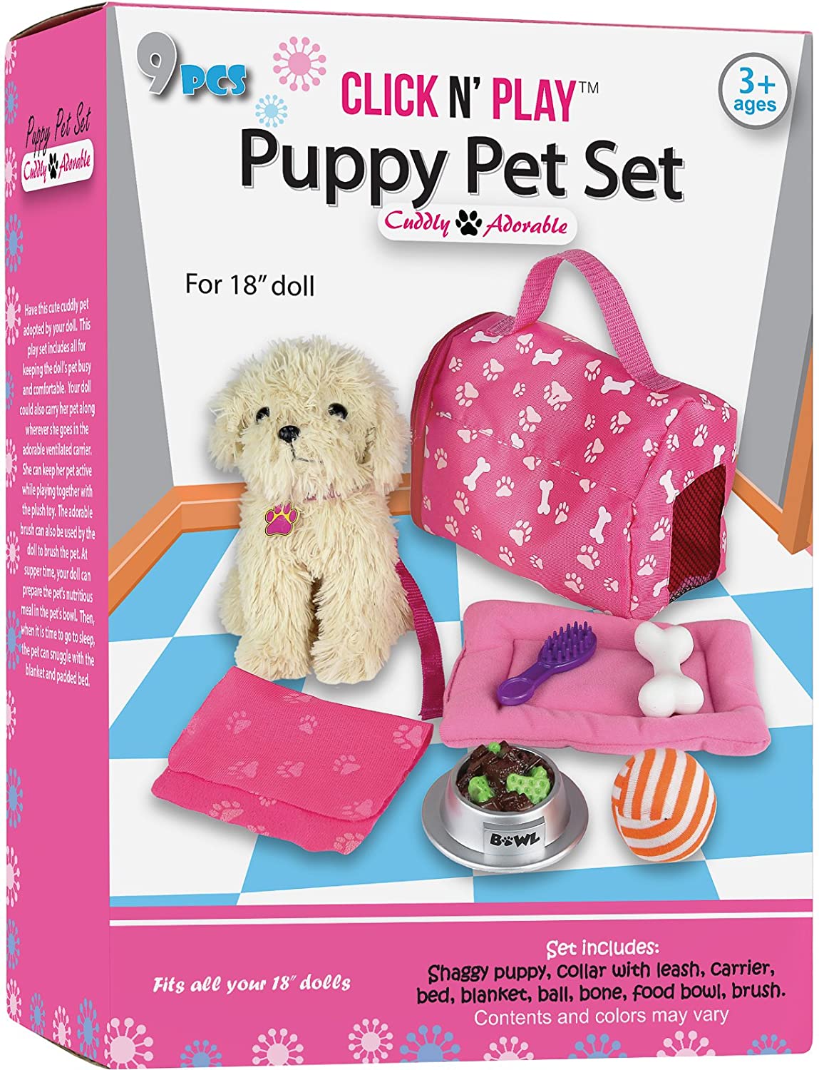 Click n' Play 9 piece Doll Puppy Set and Accessories. Perfect For 18 inch American Girl Dolls