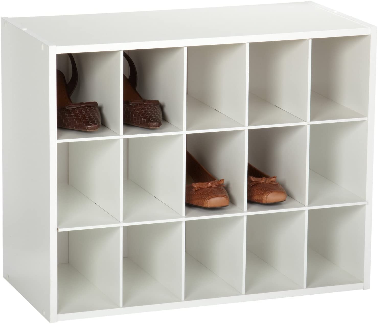 Provides storage space for shoes or other small objects. Features fifteen compartments. Size: 19-3/8" x 24-1/8" x 11-5/8". Weight capacity of 30 pounds.