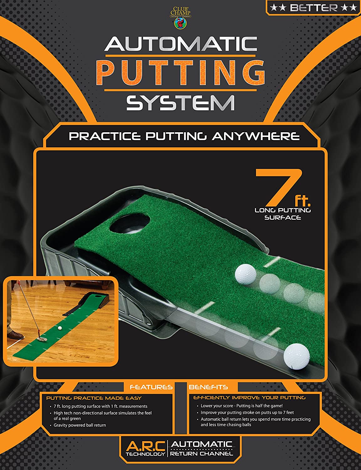 The Club Champ Automatic Putting System with 7' putting green is designed with a regulation size cup and automatic ball return. The high quality turf simulates real grass just like on the course. It has a gravity flow return and is sure to sharpen your putting skills. This system is great for practice in your home or office.