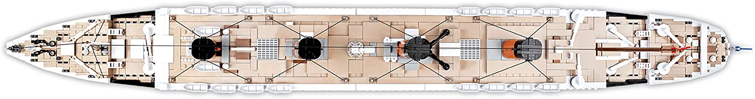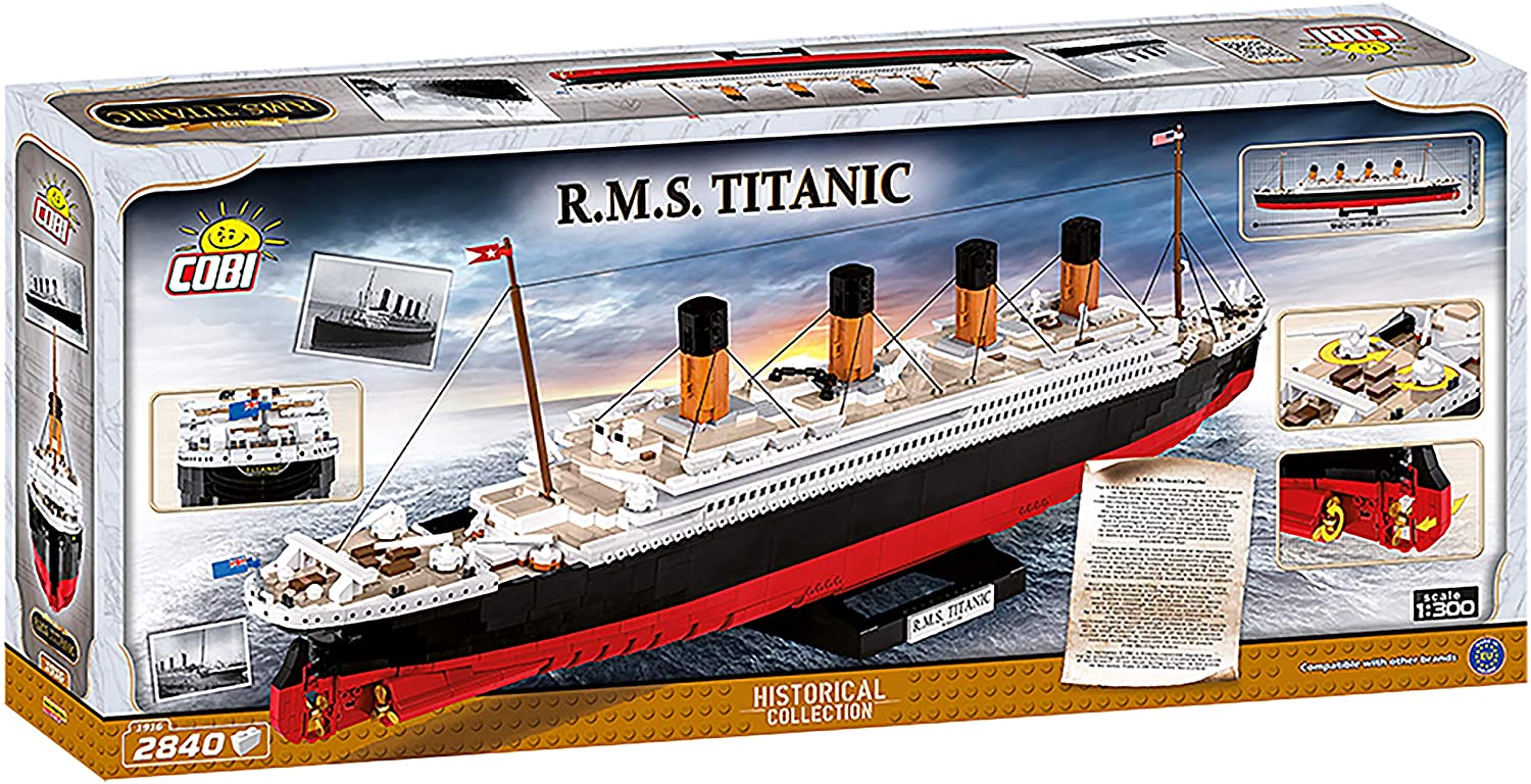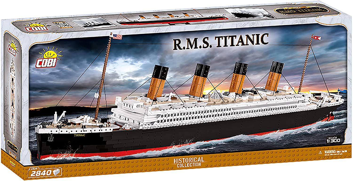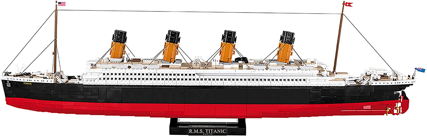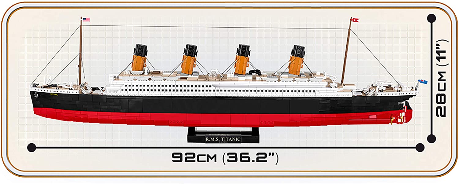 On the night of the 14th of April 1912, The Titanic was on her maiden voyage on route to New York when tragically the R.M.S Titanic collided with an iceberg and sank. This accident is one of the most famous marine disasters and the subject of many conspiracy theories. The sister ships were the Olympic and Gigantic. The ship had as many as 892 crew members. The ship was 268.99 meters long and as much as 29.41 meters wide. It was a real miracle of early 20th-century technology. The ship's model consists of 2,840 bricks and is the largest set of building blocks in COBI's history. After construction, it is almost a meter long at 92 cm, 10 cm wide and 28 cm high, in the smallest details it recreates a scale of 1:300 and faithfully reproduces the shape of its legendary original. It weighs a total of about 4.5 kg. This kit is a real challenge for all brick constructors and requires about 8 hours of work. Thanks to a very accurate manual describing the next steps of construction, which uses a system of simple icons and pictograms, everyone will understand how to build this fantastic model. It does not require gluing or painting and all graphics and inscriptions are applied to blocks in the form of very durable prints, which do not rub or fade under the influence of sun, water or little hands playing. No stickers are used in the model. The kit is for over 10 years of age. It will certainly satisfy both the youngest of brick construction fans to adult enthusiasts of nautical history and ships. Utilising the special black stand the R.M.S Titanic model will certainly look spectacular on display. 2840 high-quality components, produced in the EU by a company with more than 20 years of tradition, comply with safety standards for children's products, fully compatible with other design brick brands, printed blocks do not deform and do not fade during play or under the influence of temperature, clear and intuitive instruction based on drawings and icons, a block with the ship's name printed, scale 1:300, the set does not contain stickers, only durable prints are used, special strings are available to mount the rigging of the ship.