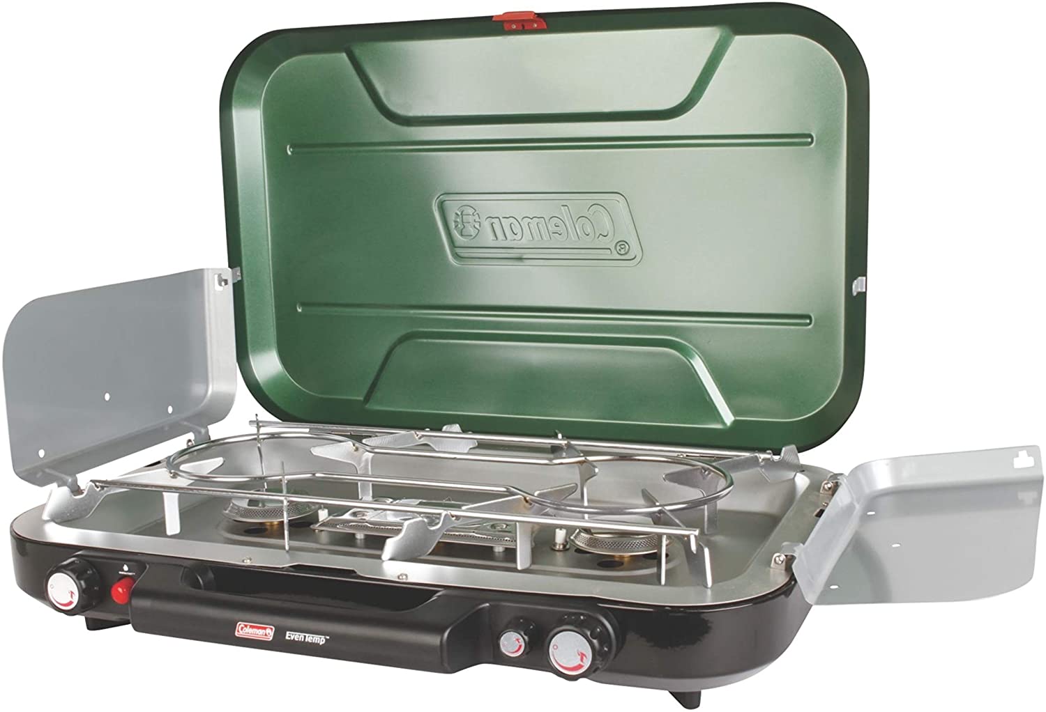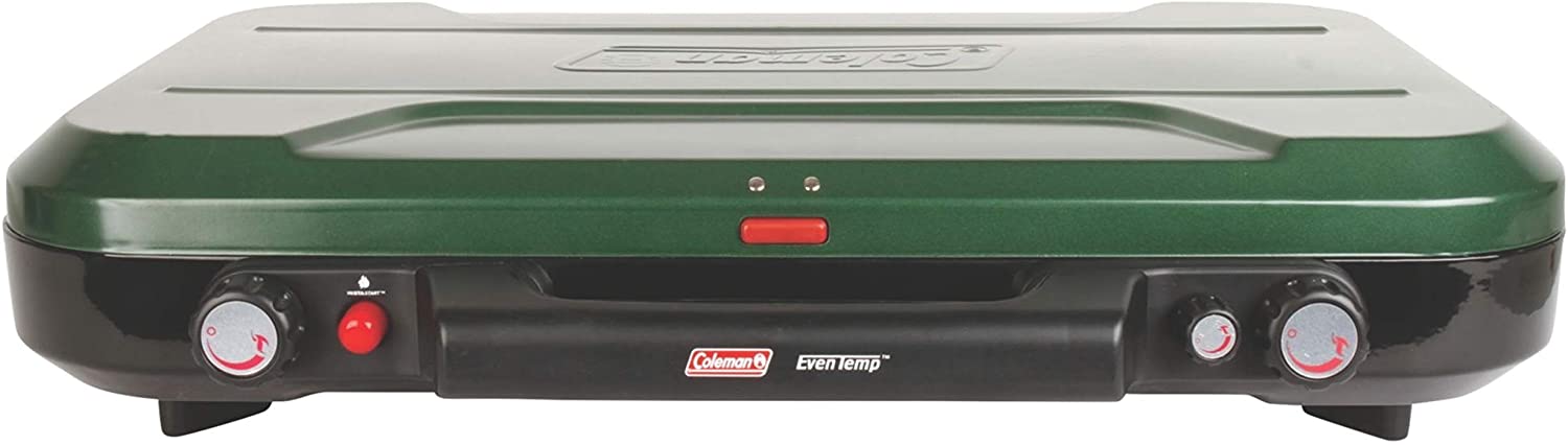 Portable propane stove fits two 12-inch pans or three 8-inch pans at once for variety of meals