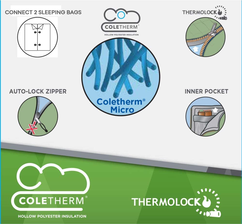 The Coleman Palmetto 30°F Cool Weather Sleeping Bag helps you rest comfortably in the great outdoors. This camping sleeping bag features a polyester cover and soft tricot fiber blend liner that keep you warm in temperatures as low as 30°F. On colder nights, zip the bag up completely to keep yourself warm. The Thermolock draft tube along the length of the zipper helps prevent heat loss through the zipper. On warmer nights, open the 2-way zipper for better ventilation. Thanks to Roll Control fasteners and a patented no-tie closure, this backpacking sleeping bag allows for easy one-person packing. The Palmetto accommodates most campers up to 5 feet 11 inches tall, and is machine washable for easy cleaning.