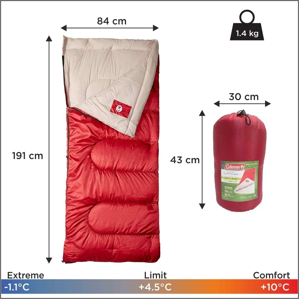 The Coleman Palmetto sleeping bag is ideal for cool weather camping, and -- at 33 by 75 inches (W x D) -- it comfortably fits most campers up to five feet, 11 inches tall. The bag is durably constructed of a polyester cover with soft tricot liner, stuffed with three pounds of ColeTherm insulation to keep you comfortable down to 30 degrees Fahrenheit. A QuickCord storage system enables easy storage, with no tying required.