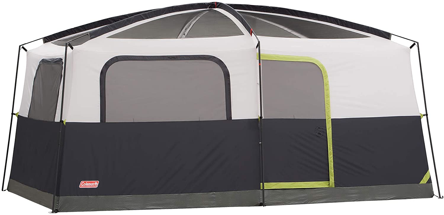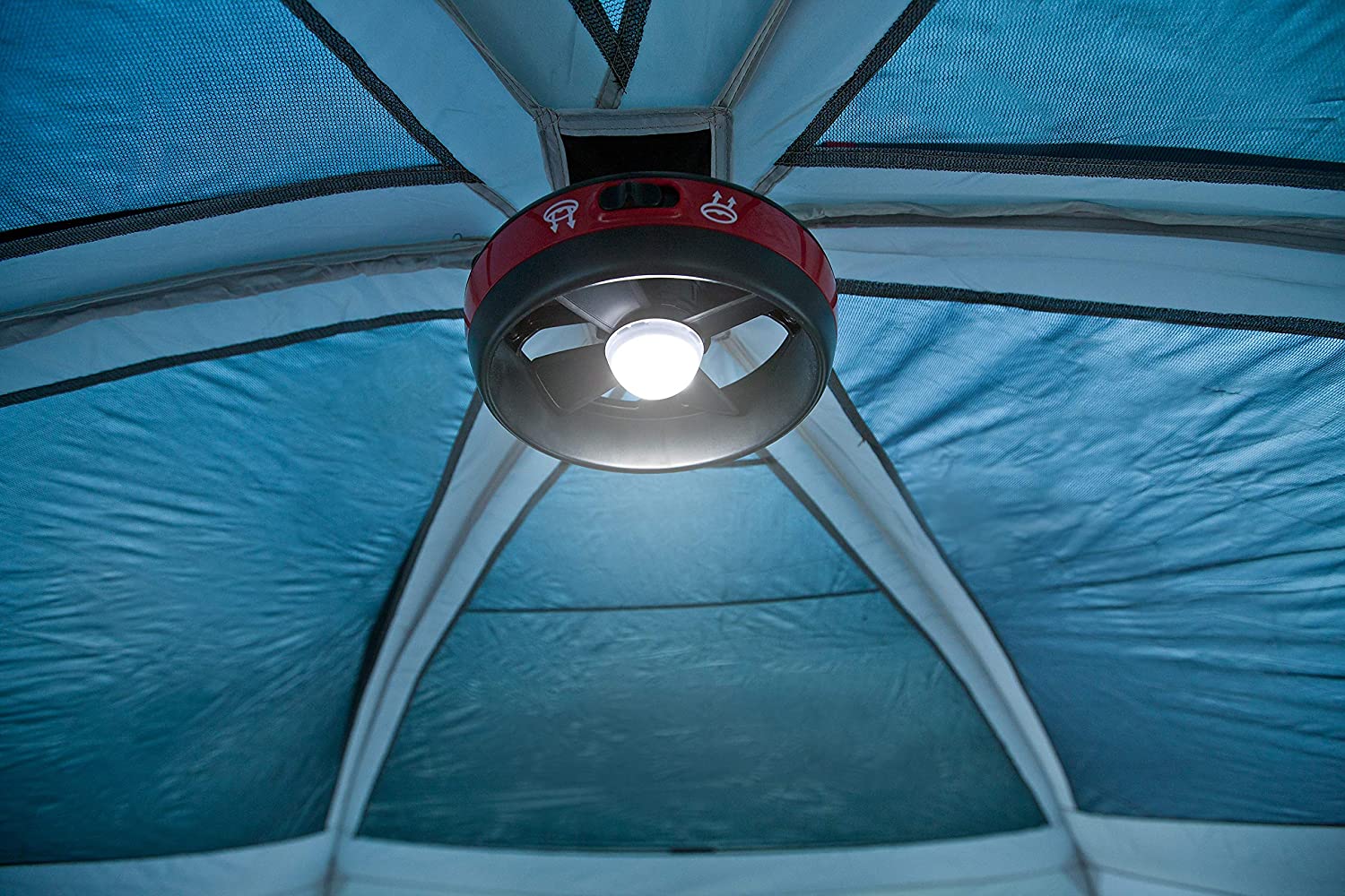 With its spacious design, LED lighting, and reversible fan, the Coleman Prairie Breeze 9-Person Lighted Cabin Tent makes the campsite feel like home. This cabin tent is guaranteed to keep you dry thanks to a WeatherTec system that uses patented welded floors, inverted seams, and a covered zipper to seal out the water. The integrated fan system provides cool comfort on hot days, while the built-in LED lighting provides bright overhead illumination that's perfect for reading a book or studying a trail map. Designed to withstand rugged outdoor conditions, this tent is constructed from durable Polyguard fabric that endures seasons of use. Setup is simple thanks to the snag-free continuous pole sleeves and Insta-Clip suspension that secures the tent poles with a snap. A range of other convenient amenities--including storage pockets, six oversized windows, and an E-port for routing electrical power--round out this fully featured camping tent.