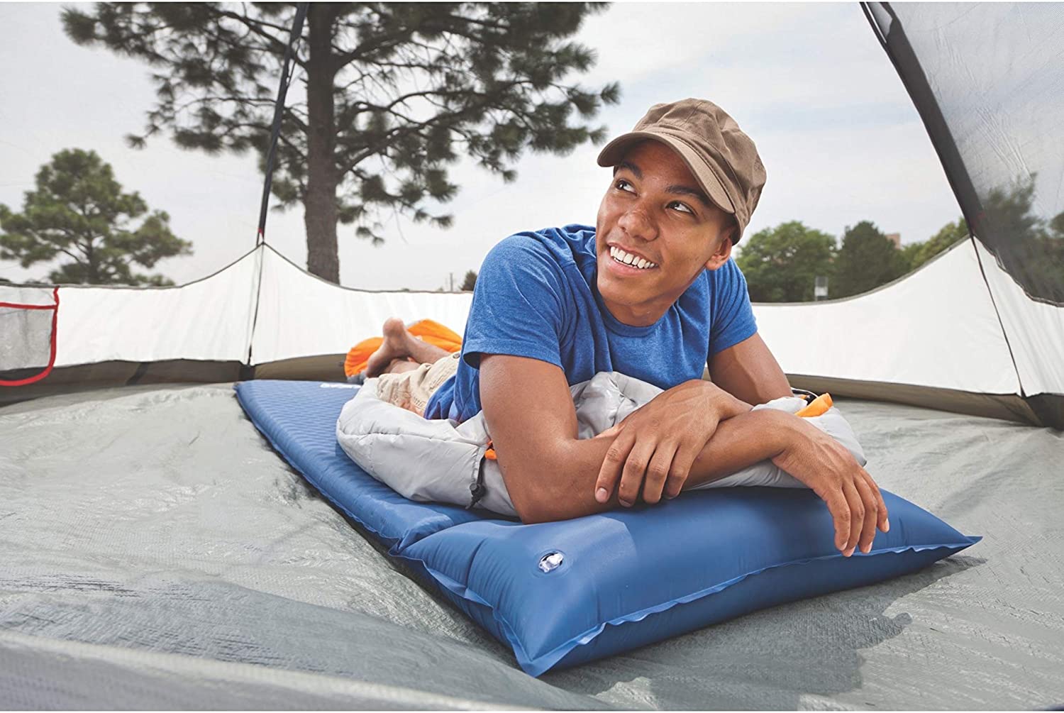 - Inflatable sleeping pad provides extra cushioning on camping trips