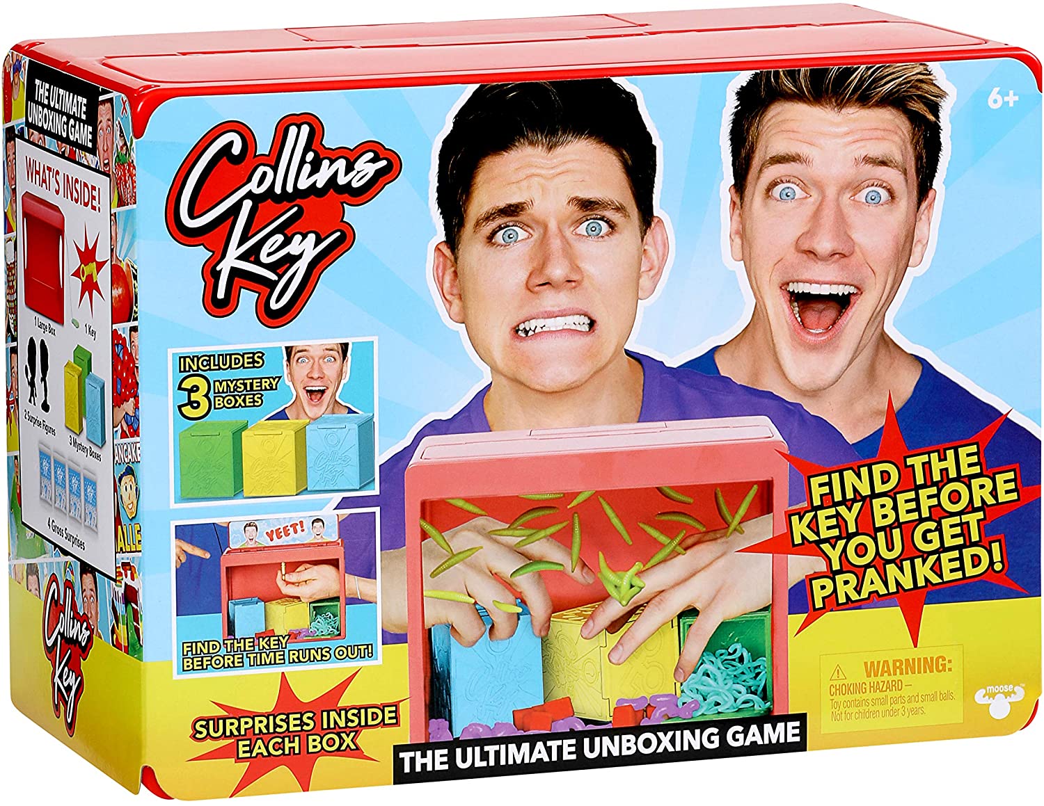 Now you can create your own fun challenges and pranks just like you see on the Collins Key YouTube Channel! The Collins Key Ultimate Unboxing Game is an epic pack where fans can play the ultimate blind box challenge. Race the clock to find Collins Key and activate the YEET! pop-up. But if you run out of time you'll end up covered in fake maggots. EEW, GROSS! The Collins Key Ultimate Unboxing Game includes one large Mystery Box with a tray full of fake maggots, and three smaller Mystery Boxes that contain 2 Collins Key figs, Collins Key and 3 so satisfying surprises! You can even take this game to the next level by adding additional Collins Key Mystery Boxes (Sold Separately) or even create your own awesome challenges with ingredients at home! Are you up for the ultimate unboxing?