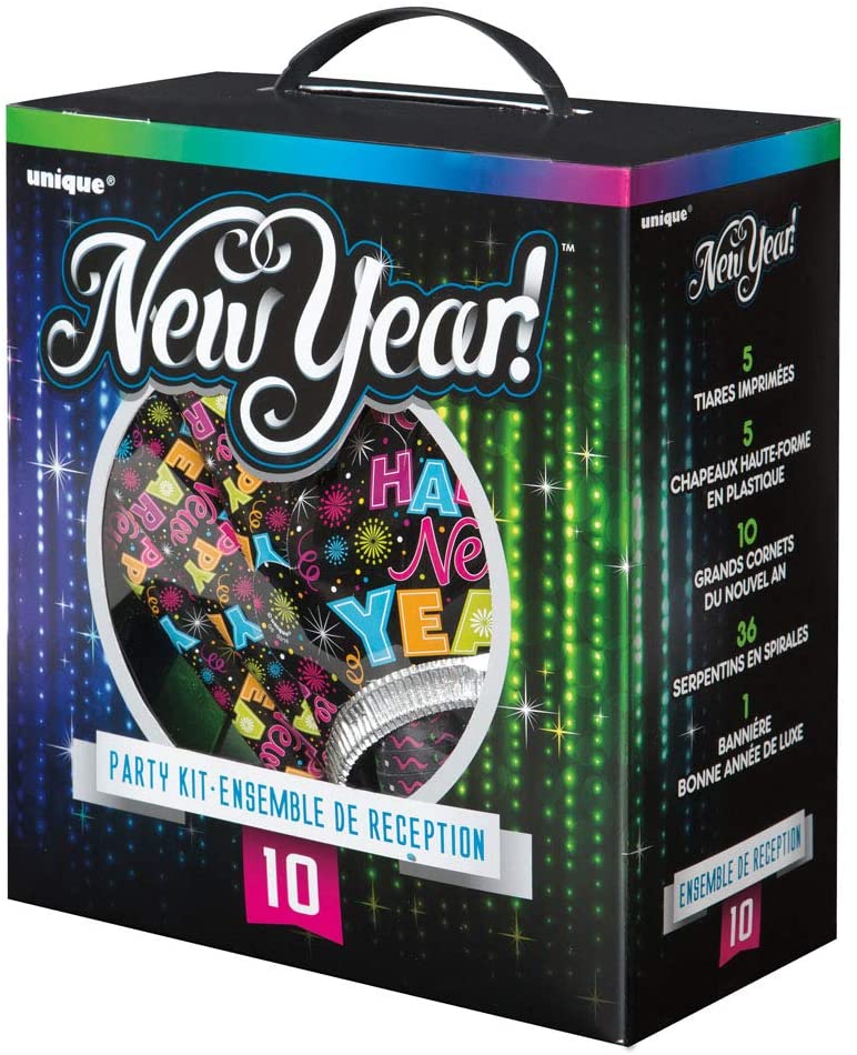 Go all out on December 31st with our New Years Party Kit for 10. Decorate the party space with the gleaming New Years banner and serpentine throws. Arrange the classic party horns on top of a party table or pass some out to guests as they arrive. Make sure everyone has a party hat or tiara to wear when the ball drops