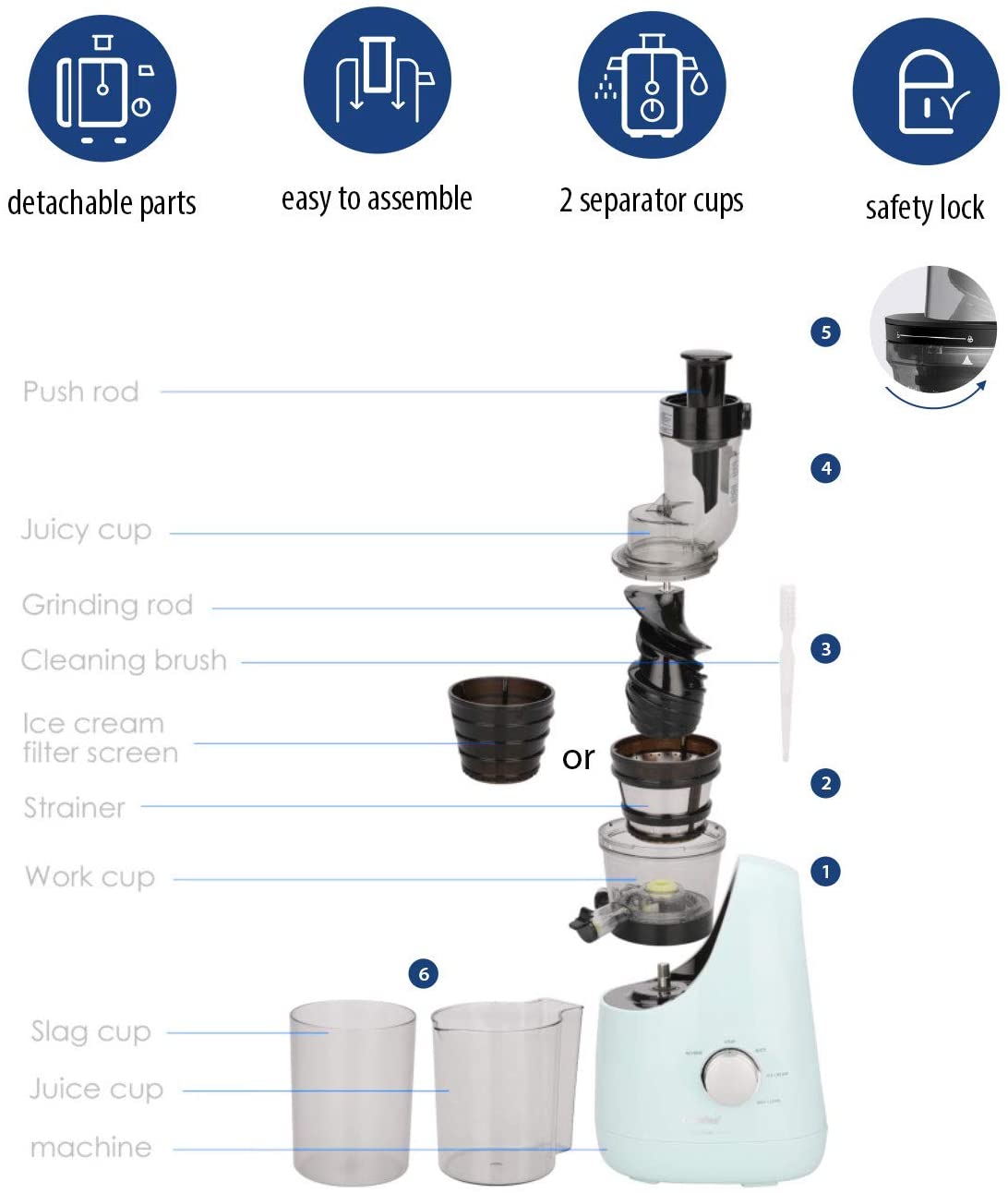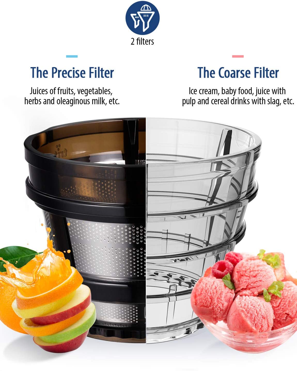 - Versatile and multi-function juicer: the juicer is professional for making silky and fresh juice and smoothie, and it is also a great ice cream maker, Easy to make tasty ice cream with frozen fruits. Ice strainer and filter are designed for making ice cream and juice separately. And anti-drip adjustable flow spout for easy pouring.