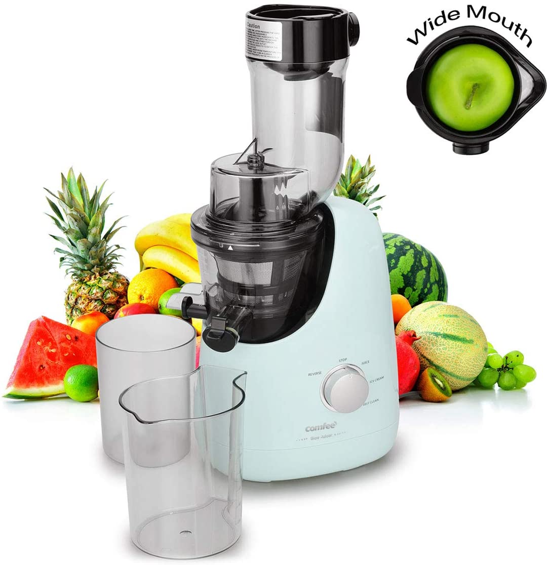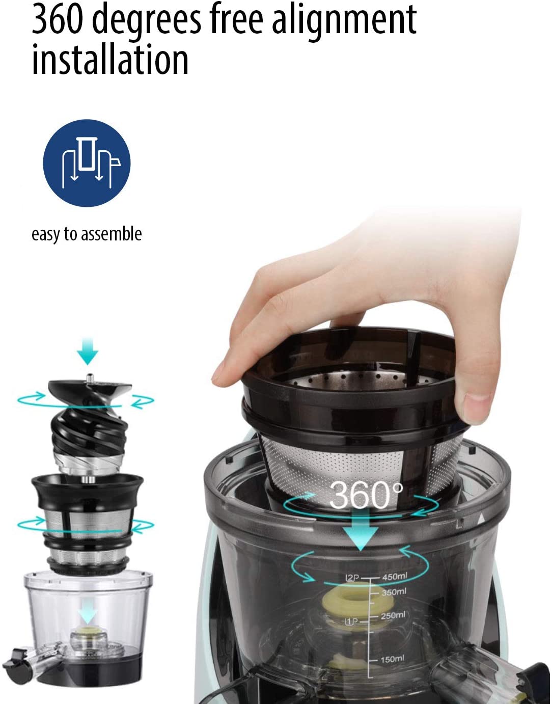 - Extra wide feeder chute and reverse function: wide feeder chute easily accommodates large fruits and veggies, for example it can fit in one orange or big Apple without cutting It. Reverse function helps the juicer keep working smoothly when the the pulp get clogged inside, just select reverse function and problem can be solved.