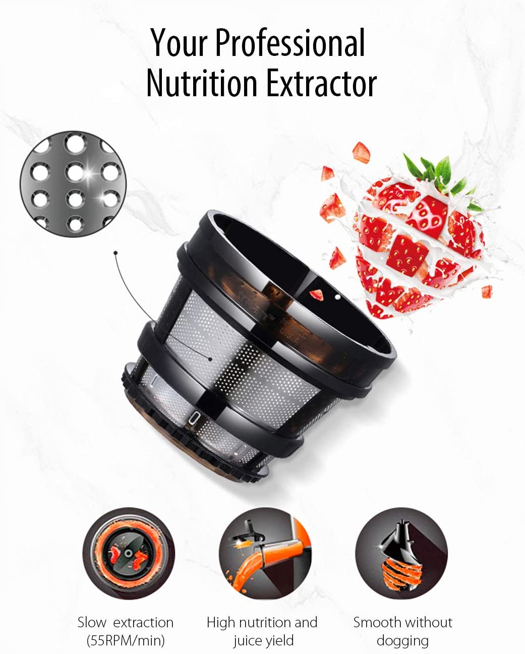 - High rate juice Extractor and slow masticating juicer: slow squeeze and cold press juicing technology retains maximum nutrition and leaves the driest pulp; giving minimal oxidation, no foam juice and maximum health protection. Processing speed: 55 RPM