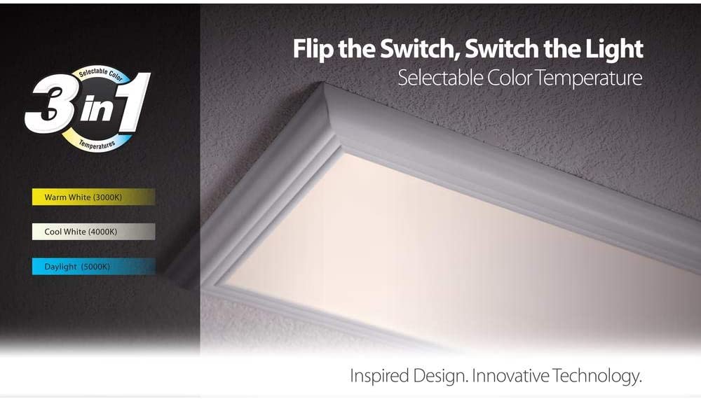 Get the right light for any situation or task with the Commercial Electric 1 X 4 ft. Cottage White LED Energy Star Deco Ceiling Flush Mount Light Fixture with Selectable Color Temperature. Its ultra slim low profile decorative design is perfect for any low ceiling area and the no glare edge-lit LEDs are integrated so there are no bulbs to replace. With our selectable color switch you can preset your preferred light color temperature: soft white bright white or daylight (3000/4000/5000K) or set it to switch for an easy toggle between color temperatures with a simple flip of a standard light switch. This energy-efficient fixture uses 50-Watt of electricity and up to 80% less energy than a standard incandescent light bulb and produces even light distribution of 3800 Lumens. The streamlined design of these LED flat panels combined with patent pending easy-to-install mounting brackets enables simple installation in both residential and commercial buildings. This white ceiling light fixture has an average life of 50 000 hours / 45.7 years can be mounted as a ceiling flush mount or wall sconce and delivers Energy Star approved dimmable lighting.