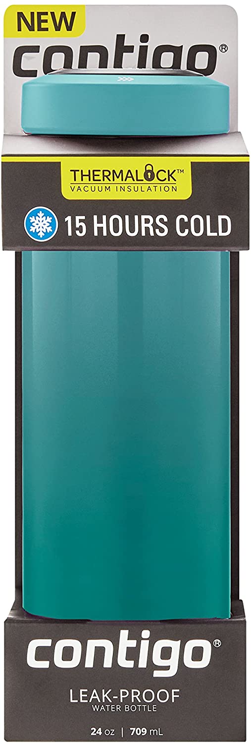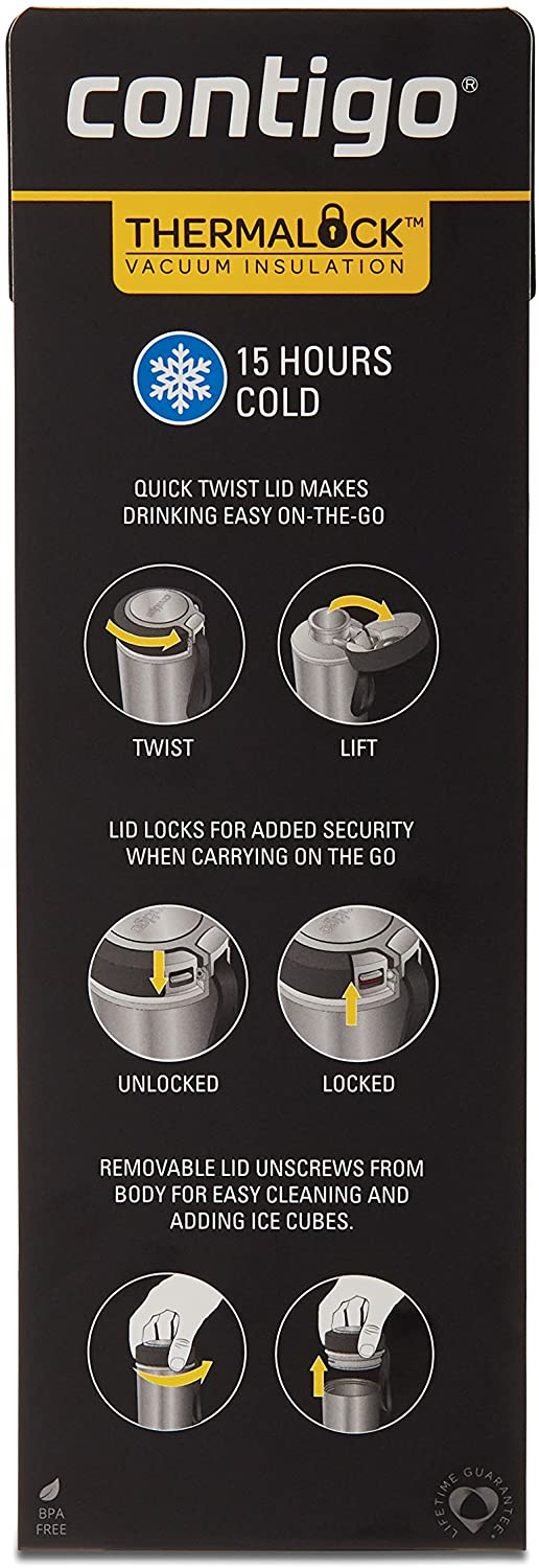 Using the Contigo Vacuum-Insulated Stainless Steel Water Bottle with a Quick-Twist Lid means you don’t have to sacrifice aesthetics for superior performance that keeps pace with your demanding life. Beneath the bottle's sleek exterior lies double-walled vacuum insulation so your water stays cold up to 15 hours. An elegantly designed quick-twist lid eliminates the need to unscrew the top completely for a sip of water, saving you time and giving you one less piece to misplace while on the go. Rest assured, the lid is leak-proof when closed and includes a discreet button lock to prevent accidental opening while on the go. Need both hands to maneuver gridlock traffic? That slim, easy-to-grip shape also happens to fit nicely in most cup holders, including the one in your car. And when you’re going from meeting to working lunch, a comfortable carrying handle conveniently keeps your new must-have by your side. With its Limited Lifetime Guarantee, Contigo proudly stands behind the design, quality, materials, and workmanship that go into every one of its products.