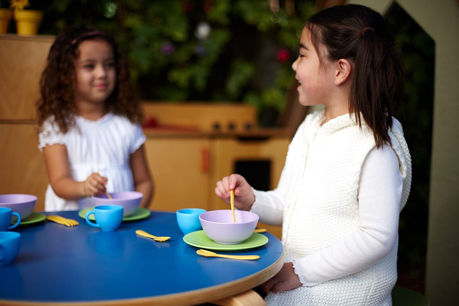 Make-believe culinary treats have real benefits for the earth when young chefs concoct them with the environmentally friendly cookware and dining set from Green Toys. Made of recycled plastic, this 27-piece set comes with a stock pot and lid, skillet, 4 plates, bowls, and cups, and 4 place settings (fork/spoon/knife). Made in the U.S.A. from recycled plastic milk containers, these toys save energy, reduce landfill waste, and lower greenhouse gas emissions, all in the name of Good Green Fun.