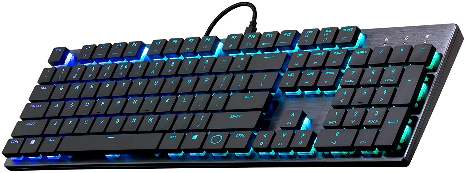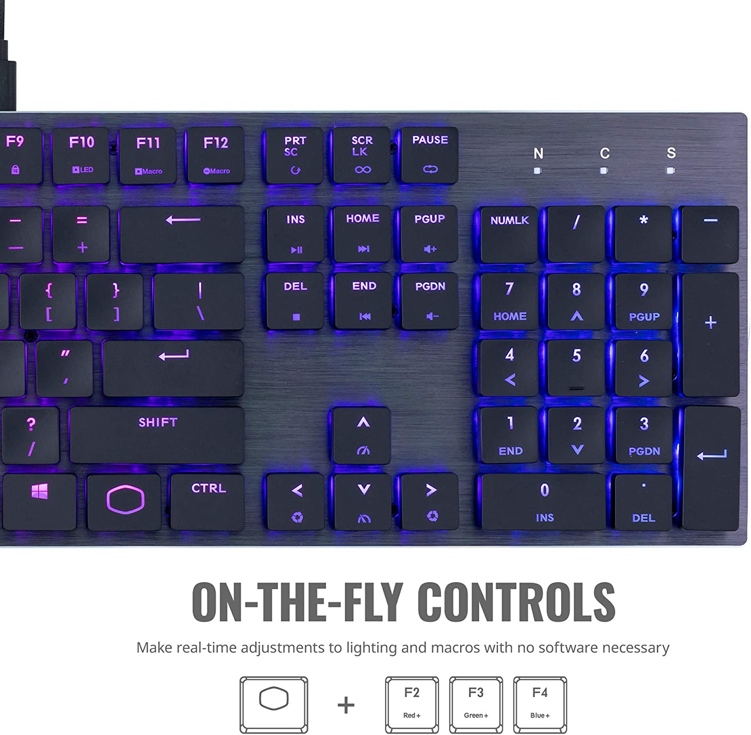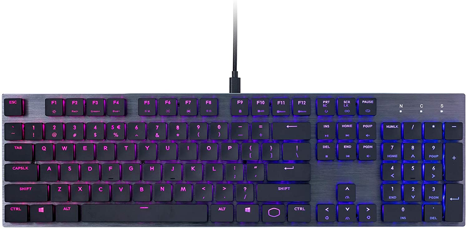 The SK650 mechanical keyboard is a slim keyboard with all the signature Cooler Master features like on the fly controls and RGB Backlighting but it adds new Cherry MX low profile switches. A reduced travel and actuation distance with extra flat keycaps means you get all the precision and durability of a mechanical keyboard with the slim styilngs of a minimalist chic let keyboard. Add in a refined brushed aluminum housing and understated LED lightbars, and you have a keyboard that looks as good as it performs. Cable- USB Type-C Detachable and Braided