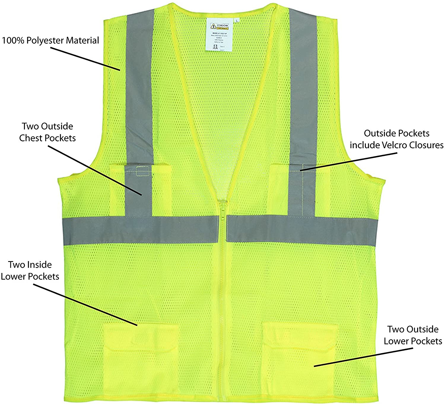 Designed to provide 360 Degree of enduring conspicuity and meet or exceed the exacting standards of ANSI 107. The entire line is independently certified compliant. Heavy duty construction and high function features. Lightweight and breathable fabrics and style increase acceptance, compliance, and safety. Class II, Surveyors Vest, Lime Mesh, Silver Stripes, Zipper Closure, Four Front Pockets.