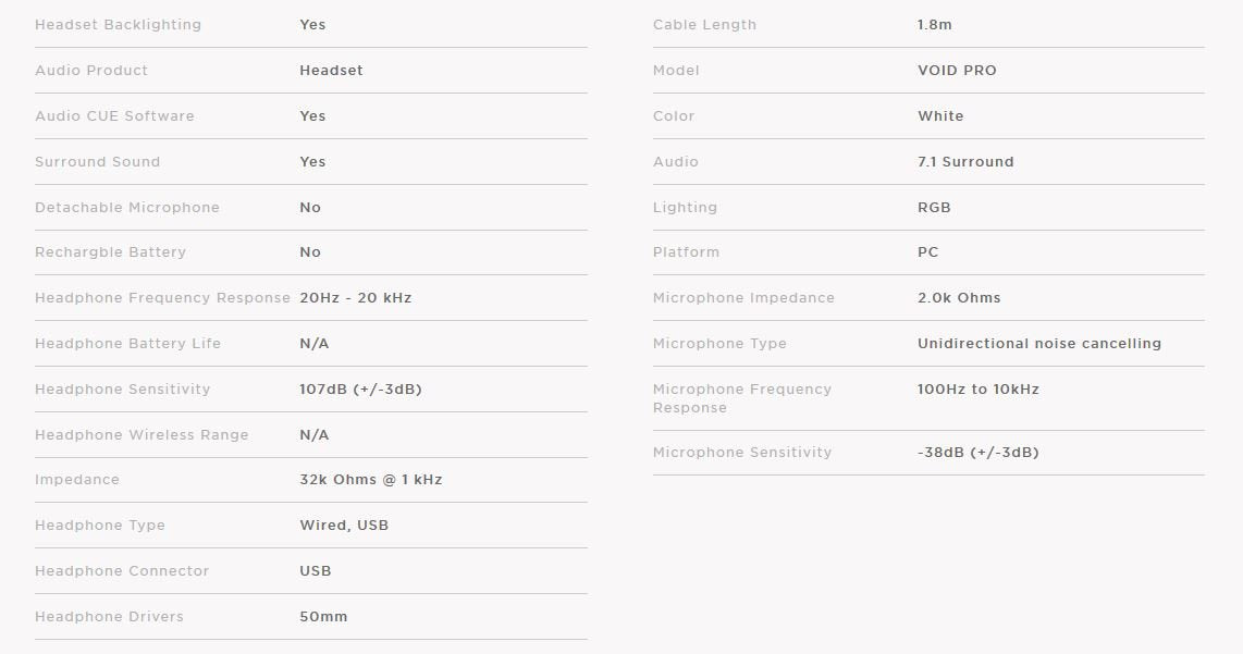 The VOID PRO RGB USB headset provides exceptional comfort, epic audio performance and legendary CORSAIR durability to deliver the ultimate gaming experience. Microfiber mesh fabric and memory foam ear cups let you play for hours while providing airflow and comfort. Tech Support # 1-888-222-4346. " Compatibility : PC with USB port and OS compatibility (Windows 10, Windows 8, Windows 7, Internet connection (for CUE software download) "