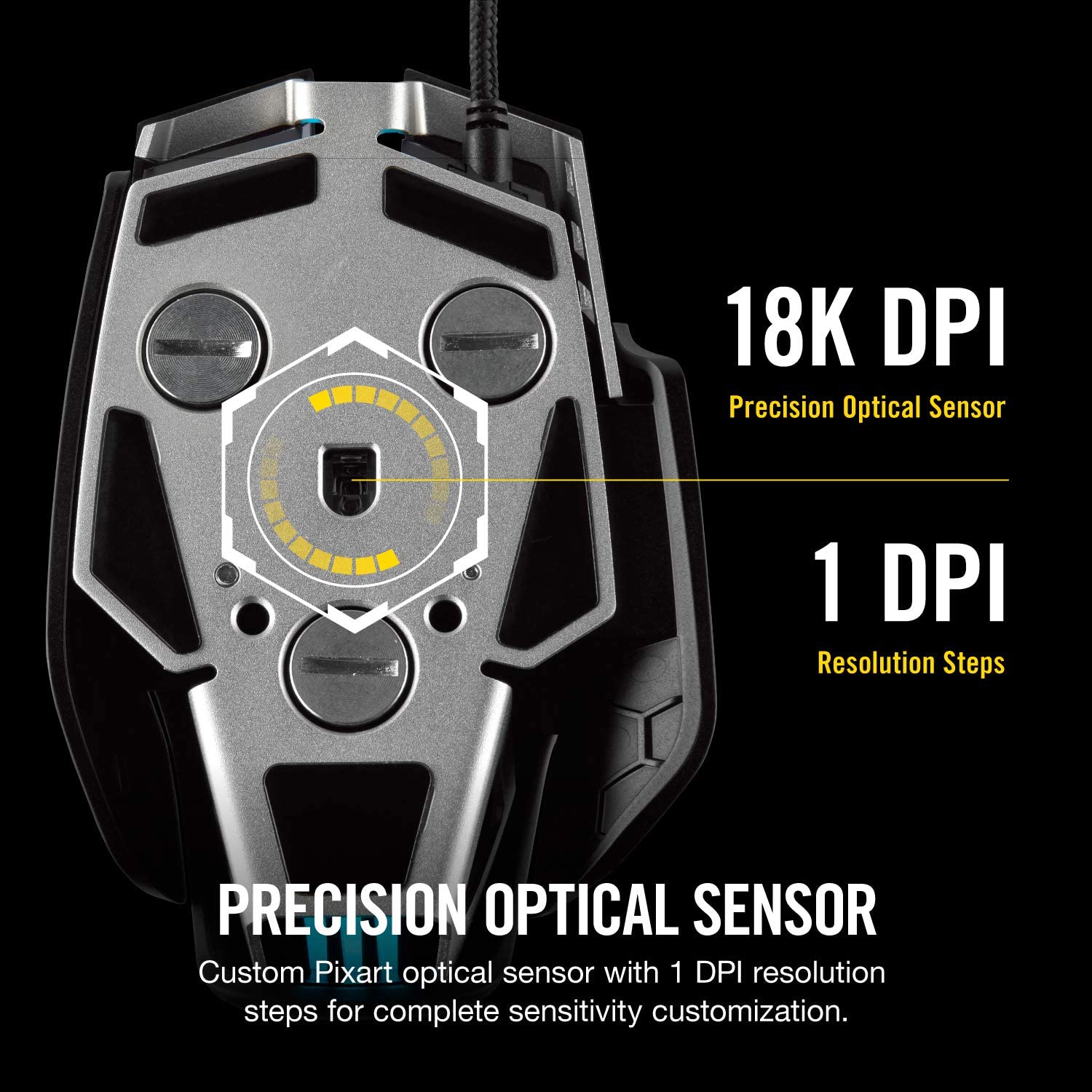 - CORSAIR’s Most Advanced Optical Gaming Sensor:Native 18,000 DPI, adjustable in 1 DPI resolution steps, gives you total sensitivity customization and ultra accurate tracking