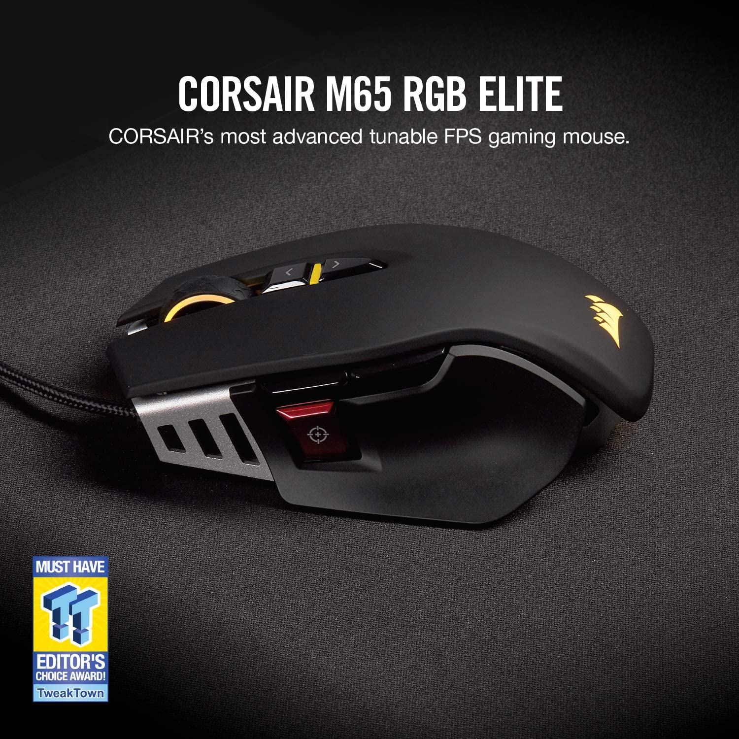 The Corsair M65 RGB Elite is CORSAIR's most advanced FPS gaming mouse yet, built around a premium aluminum frame for proven durability that will last through a lifetime of gaming. A state of the art precision 18, 000 DPI optical sensor, customizable in single DPI steps, provides personalized precision to match your play style, while a tunable weight system allows you to adjust the weight from as little as 97G to 115G. Loaded with extras, including onboard profile storage, multi zone RGB lighting, a dedicated Sniper button, and fully programmable with Corsair iCUE software, it's time to join the Elite.