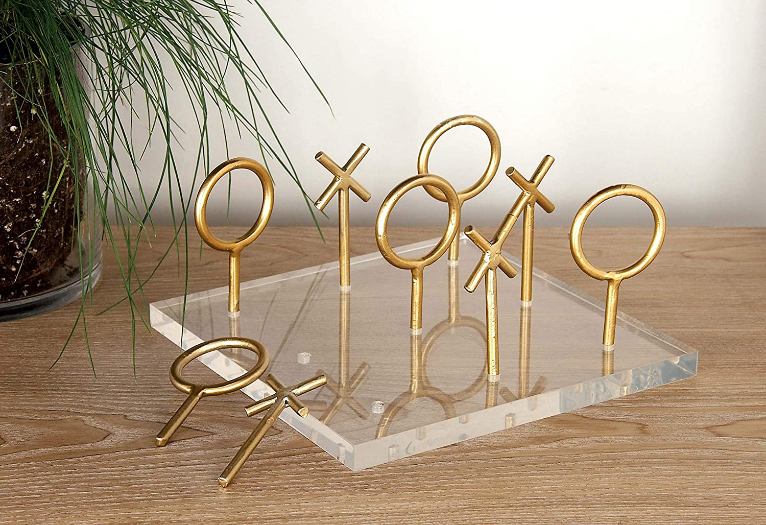 Be the hostess with the mostess at your next get together or dinner party with this glamourous gold Tic Tac Toe game set atop a clear acrylic base. The compact fits on your coffee table or side table, and the metallic gold and clear acrylic finishes tie your glam style look together, complementing your other decor and furniture. With large X and O pieces popping up from the board, it makes for super cute table décor. It’s an updated, stylish look to a classic game that everyone <3s.