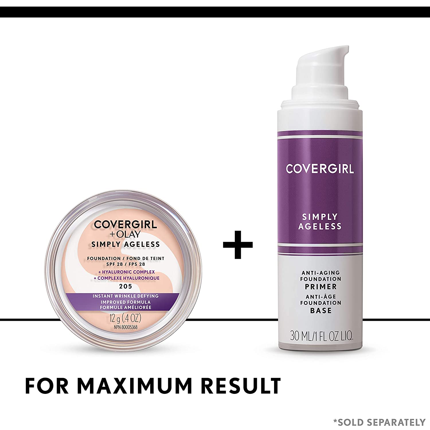 Keep them guessing your age with Covergirl Simply Ageless Instant Wrinkle-Defying Foundation. The #1 anti-aging foundation glides over fine lines and wrinkles to diminish their appearance and deliver a youthful-looking glow. Skin looks healthier and more hydrated thanks to the formula with hyaluronic complex and vitamin C, and it contains SPF 28 for protection from sun damage. Pro-tip: Use with Covergirl Simply Ageless Anti-Aging Foundation Primer for maximum results.