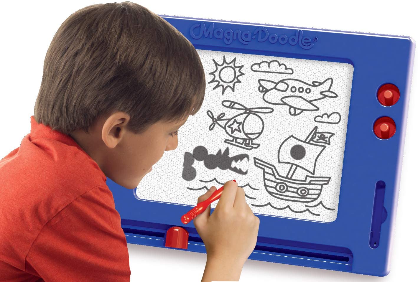 Create hours of fun with Retro Magna Doodle! The classic magnetic drawing toy provides a creative way for children to explore their imagination. Magna Doodle can be used to play games, draw pictures, write messages and so much more. The Retro Magna Doodle comes with the classic blue drawing board and red magic pen and magnetic stamps. Simply write or draw using the magic pen on the magna doodle drawing board and when ready erase like magic. The magna doodle drawing board for kids comes with 2 magnetic stamps to help with drawing or playing games like tic tac toe. To erase, slide the magnetic eraser, located at the bottom of the doodle board, side to side to make room for a new drawing or message. Take the lightweight magna doodle board on the go; the magic pen and 2 stamps fit securely into the magic board to provide hours of fun. Retro Magna Doodle for kids is 14.5 x 1.5 x 11.5 inches. Incorporate the Retro Magna Doodle into your child’s STEAM selection of toys. The Magna Doodle board and magic pen are excellent for practicing hand-eye-coordination and aiding with fine motor skills while still bringing lots of play patterns. Retro Magna Doodle draws like magic, erases like magic! Great for ages 3 and up.