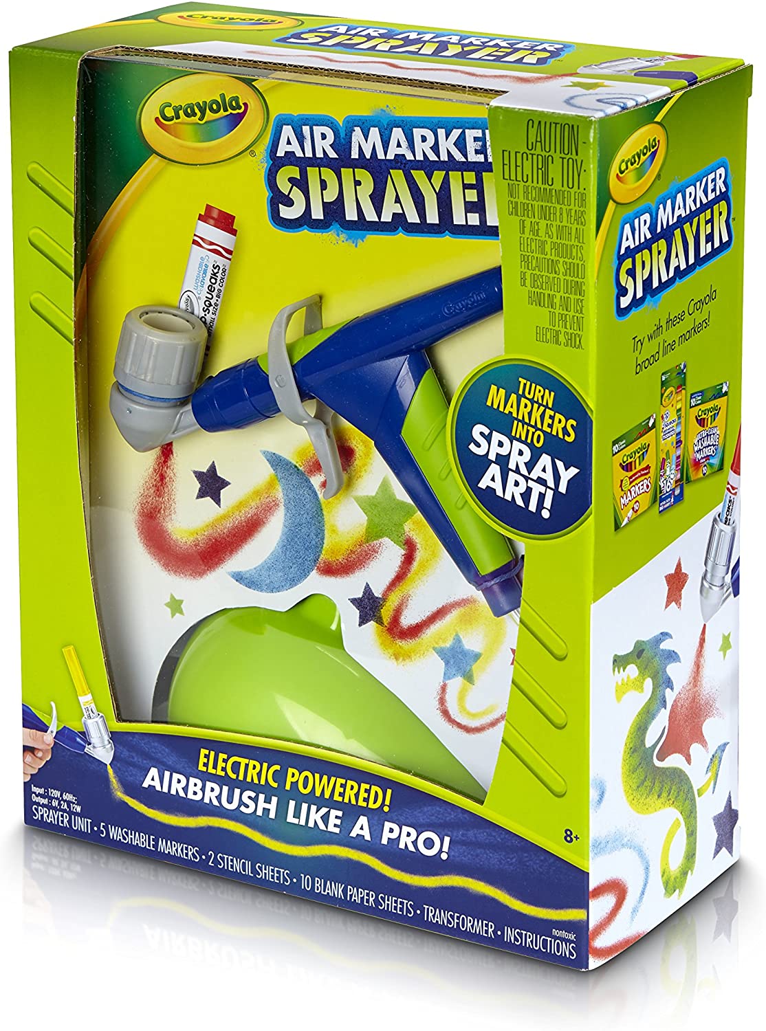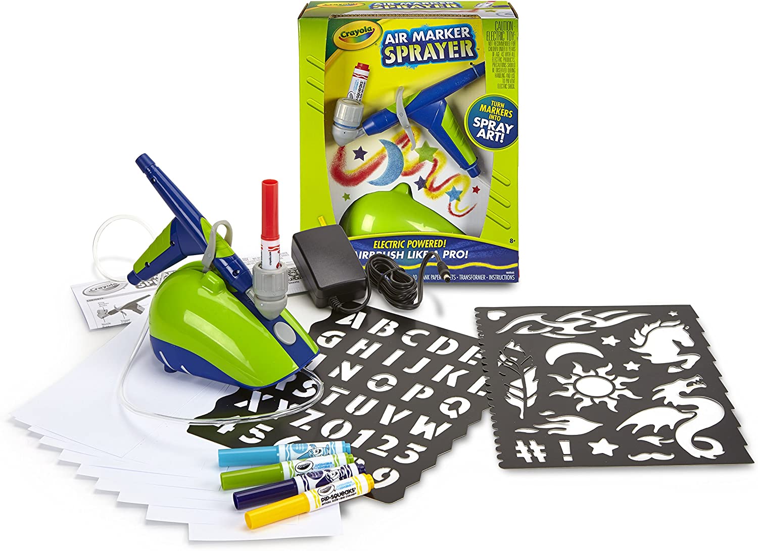 - SPRAY WITH MARKERS: Enter the world of spray art and airbrushing with the Crayola Air Marker Sprayer. This easy-to-use sprayer converts ordinary markers into a vivid spray of ink. 5 Pip-Squeaks Washable Markers, 2 Stencil Sheets and 10 sheets of paper.
