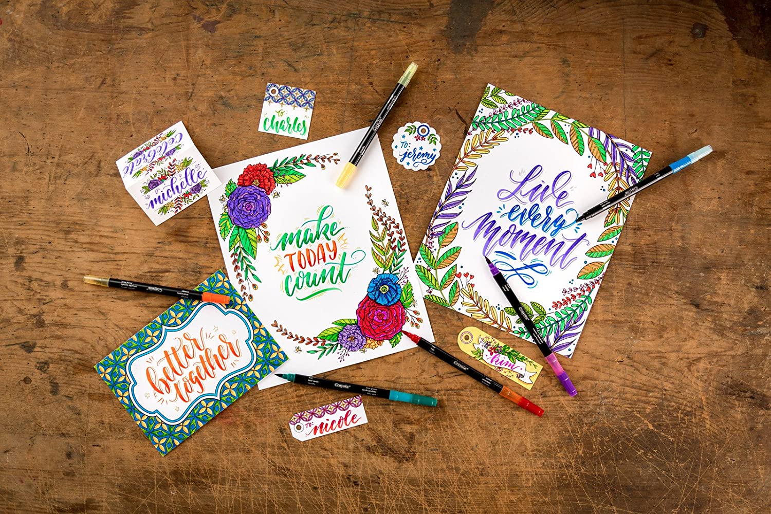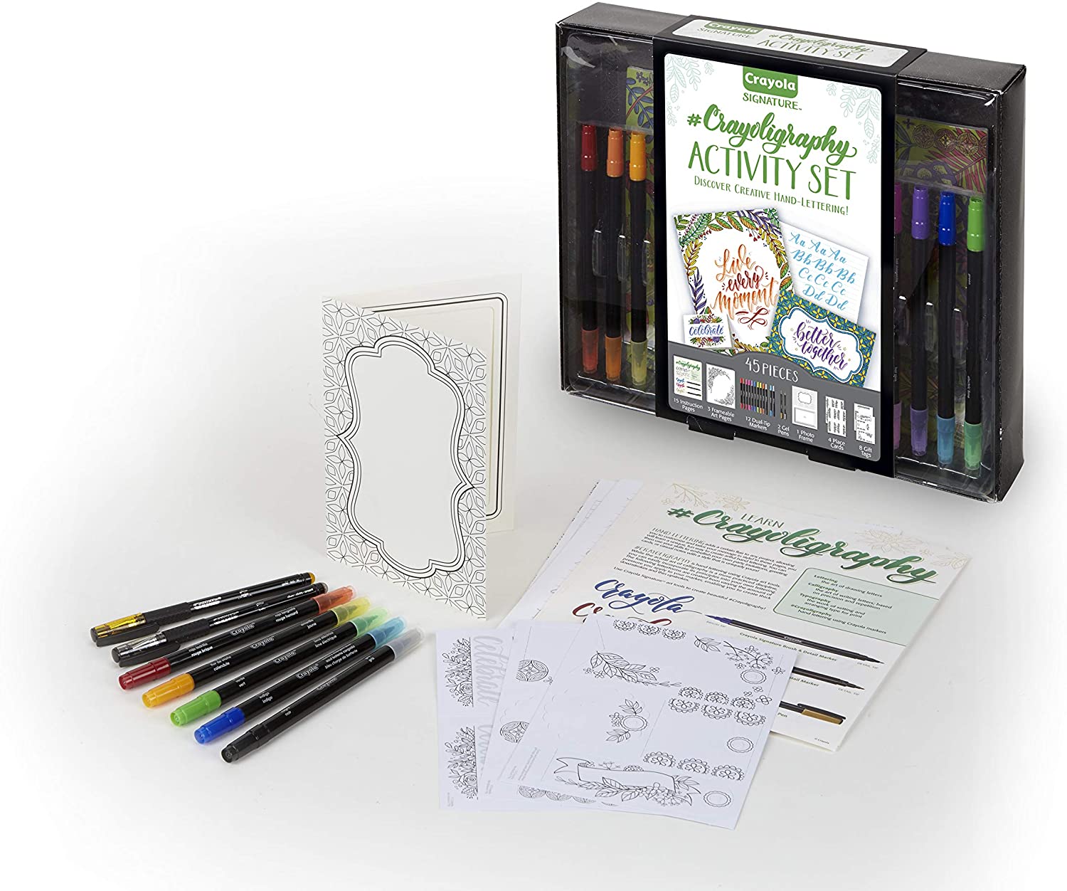 • HAND LETTERING SET: Crayola Crayoligraphy Hand Lettering Art Set features 15 pages of Instructions, 12 Dual-Tip Markers, 2 Gel Pens, 3 Frameable Art Pages, 1 Photo Frame, 4 Place Cards, and 8 Gift Tags.