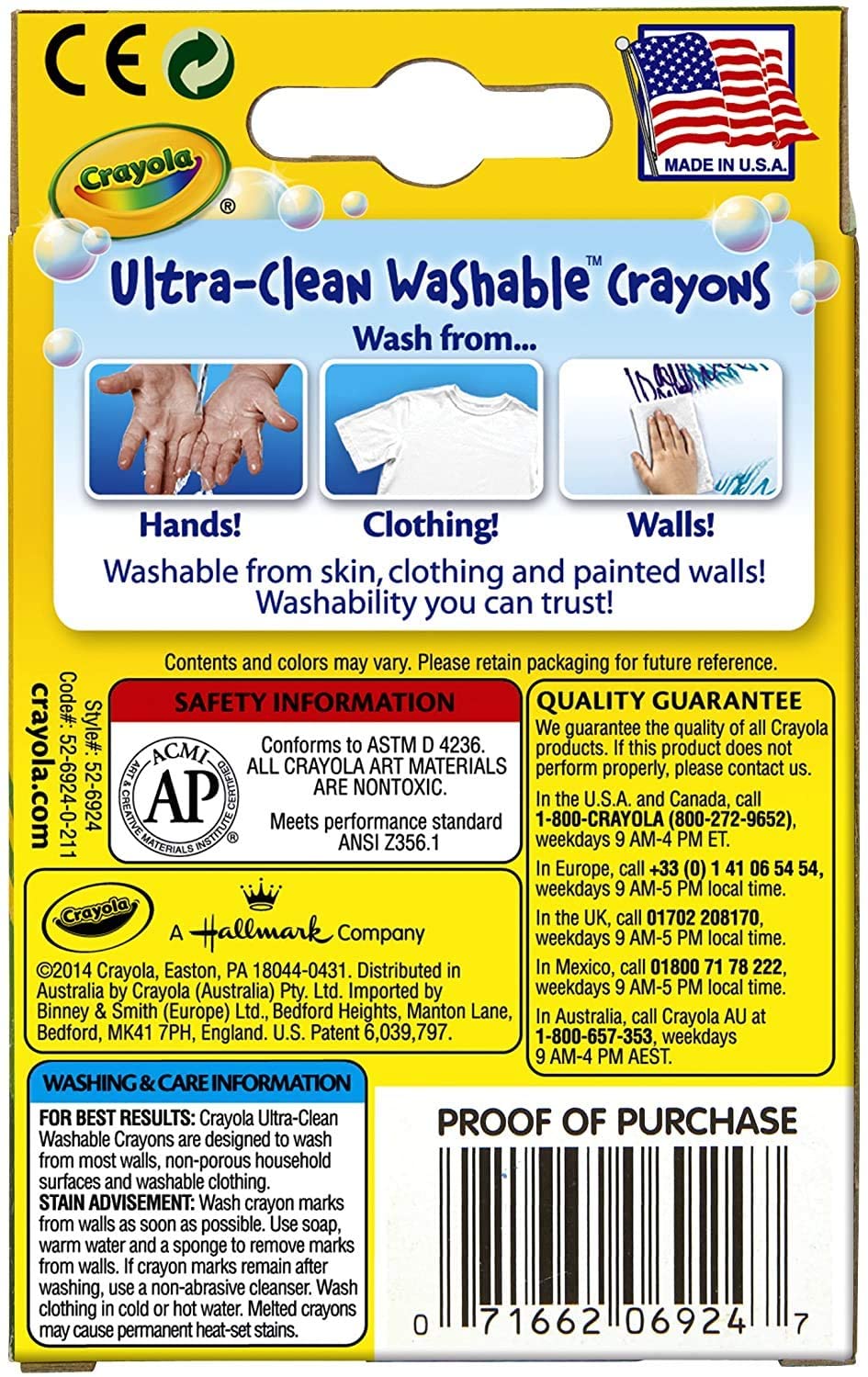 - Washable crayons: Ultra clean washable crayons are washable from skin, clothing, and painted walls.
