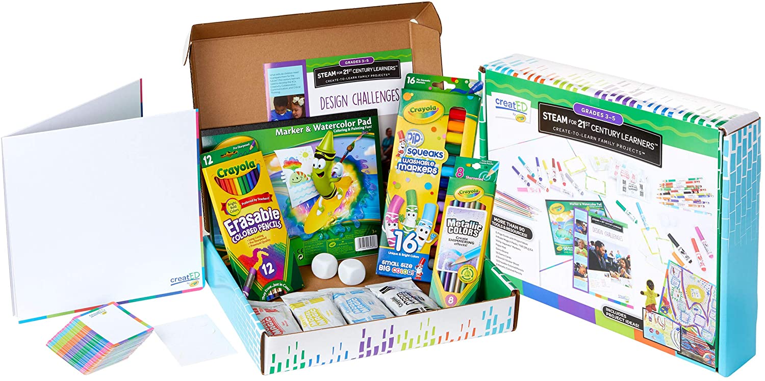 Teach kids STEAM skills with fun at home activities developed by the create-to-learn program from creatED by Crayola. This STEAM Kit helps to prevent learning slide that occurs due to school closures and summer break periods, serving as an excellent homeschool resource. The colorful, imaginative products in this set help families make STEAM learning projects a great way to spend time together. This STEAM activity bundle is a creative at home learning material that includes colorful art supplies and an informational parent guide so that families can practice curriculum concepts together—and have lots of fun too! The STEAM for 21st Century Learning – Design Challenges Kit for grades 3-5 includes 3 visual, easy-to-use, project-based learning ideas—Parks & Playgrounds, Dream Car, and Weather or Not Game. These STEAM projects for kids help nurture curiosity, creativity, communication, collaboration, and critical thinking through age-appropriate activities. They are also great family engagement ideas, because they use a project-based learning foundation so students learn important planning, design, and creativity skills supported by family.