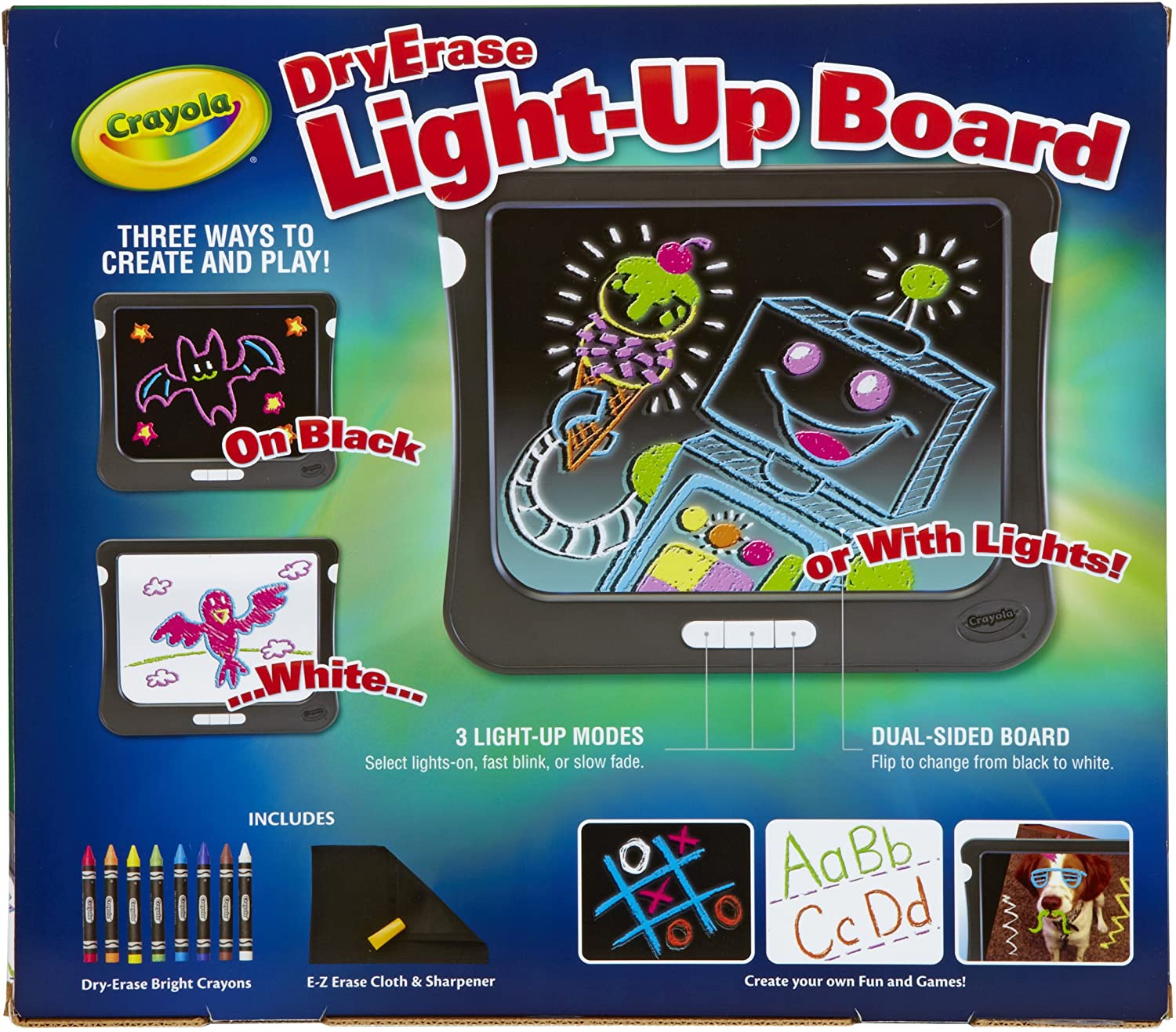 The Crayola Dry Erase Light Up Board Drawing Set lets you create colorful designs on a lighted, dual-sided board. Use bright dry erase crayons on the black side to make images 'pop' or on the white side for classic white board creations! Use this coloring set to enhance your creations with 3 lighting options to choose from. Just add 3 AA batteries (not included) then start changing between a constant light, a quick blink, or a slow fade. The erasable crayons won't dry out and stay on point with the provided crayon sharpener. Use the E-Z Erase Cloth to wipe clean and prepare for more fun.