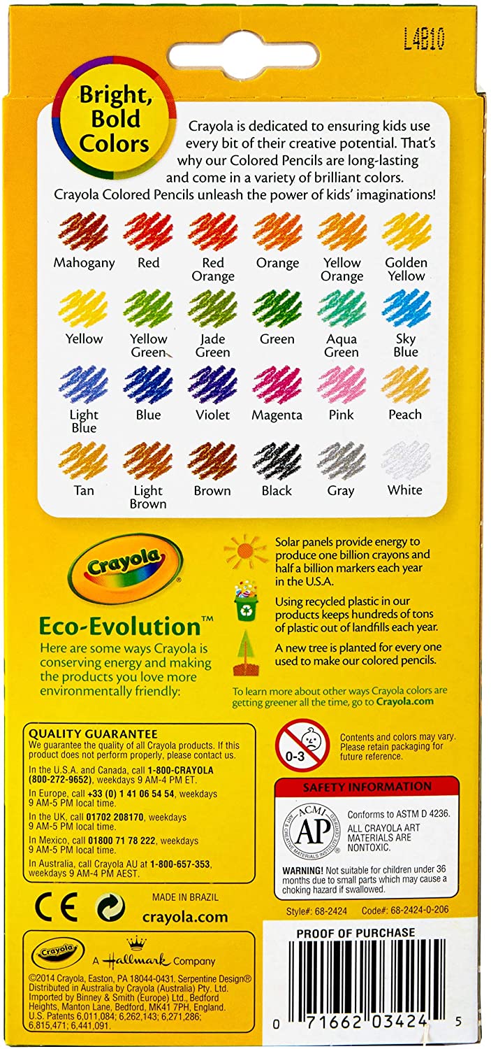 • CRAYOLA COLORED PENCILS are made from reforested wood – which is unique to Crayola – and never from tropical rainforest or endangered species. Including 24 bright, bold colors with smooth lay down, these pre-sharpened long pencils are strong and durable