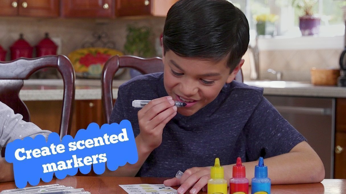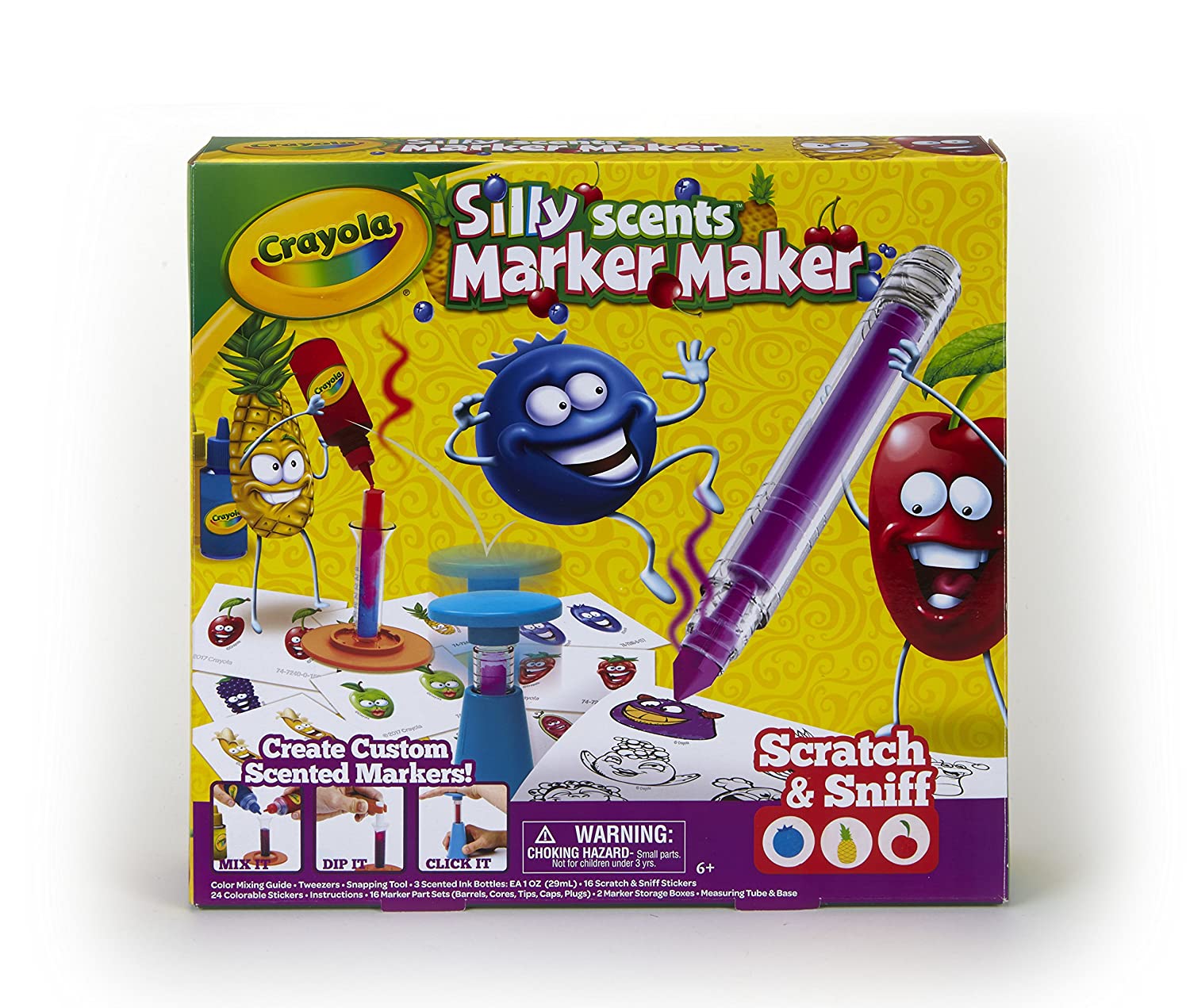 Create your own custom, great-smelling markers with the Crayola Silly Scents Marker Maker. This fun and easy-to-use set includes everything kids need to make 16 unique fruit-scented markers. Use the color mixing guide to learn how to make new colors, experiment mixing the three fruity scents, and then name your new creations. Blank sticker pages let you color in the stickers with your new markers and see how they smell. Also includes Scratch & Sniff sticker pages for extra smelling fun!