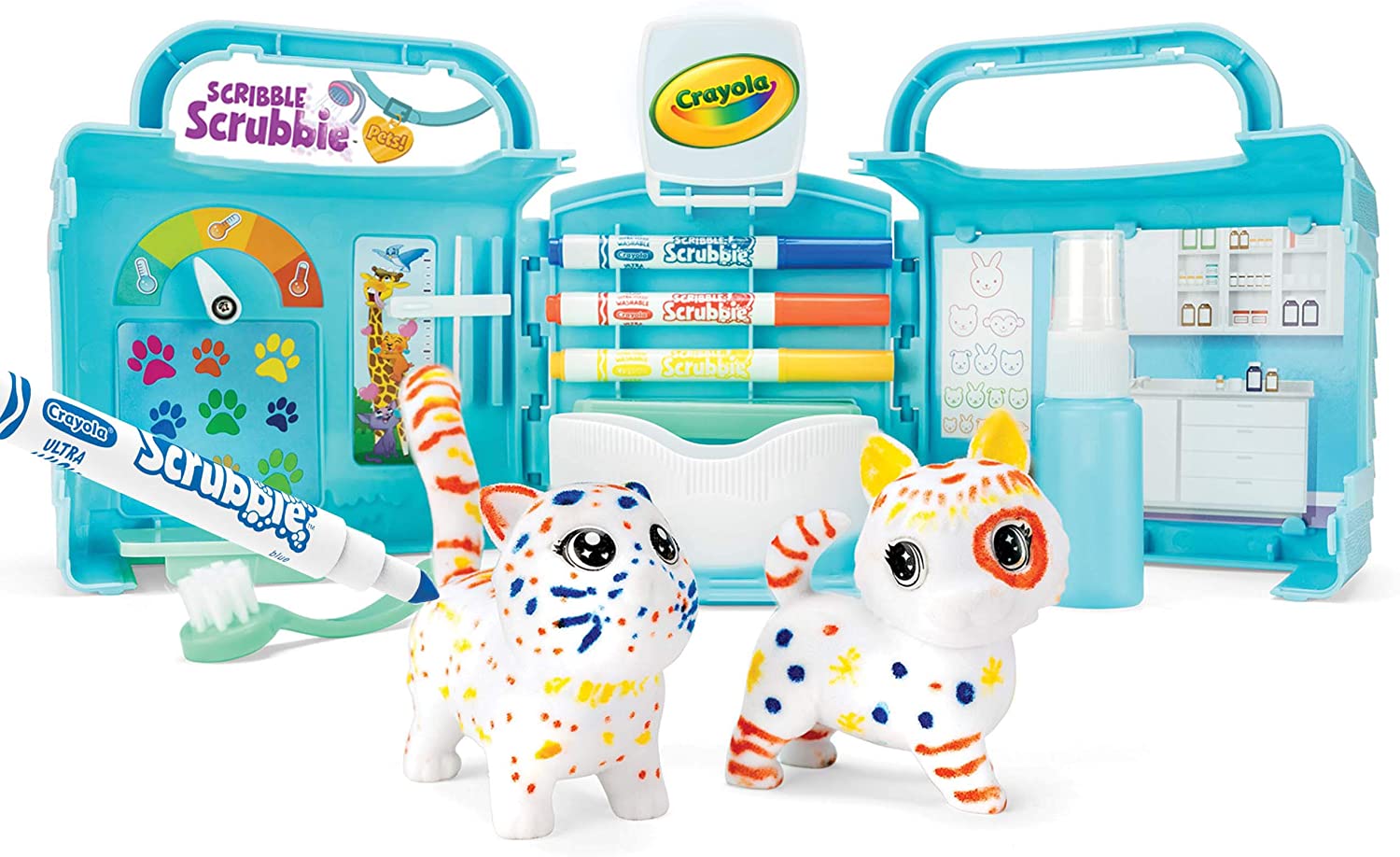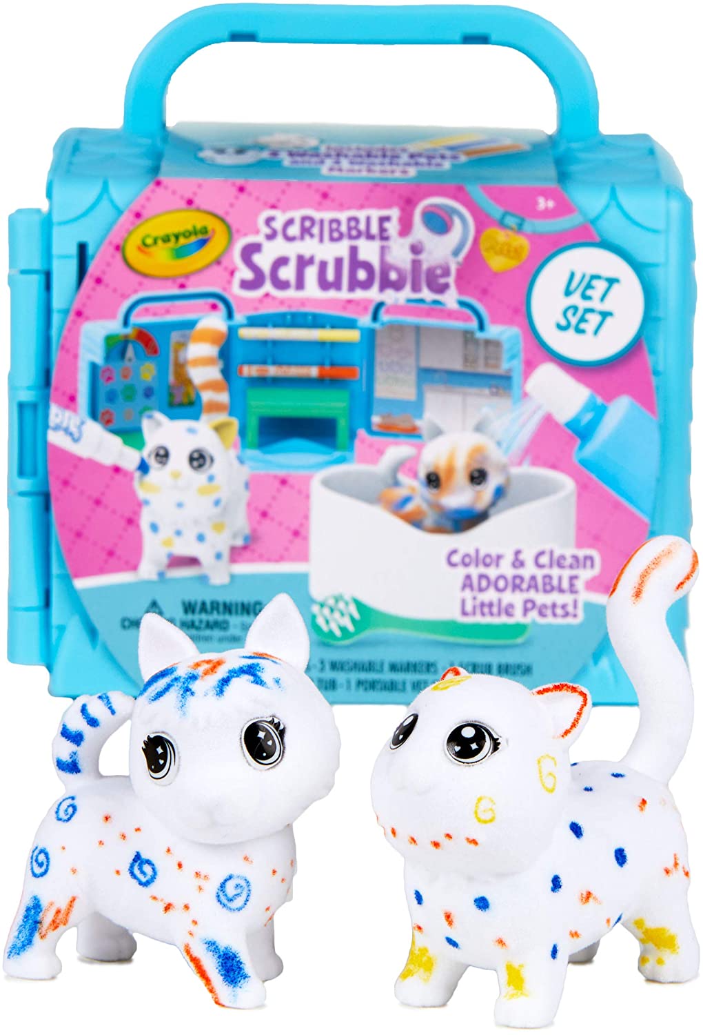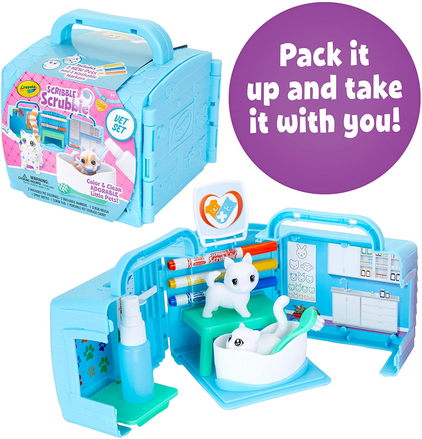 • SCRIBBLE SCRUBBIE PETS: The Scribble Scrubbie Pet Vet Toy features a folding vet playset with 3 Scribble Scrubbie Markers, 2 Toy Pets, Instruction Sheet, Spray Bottle & Brush.