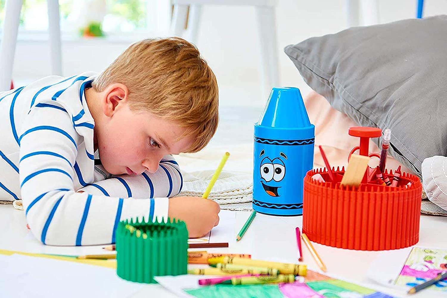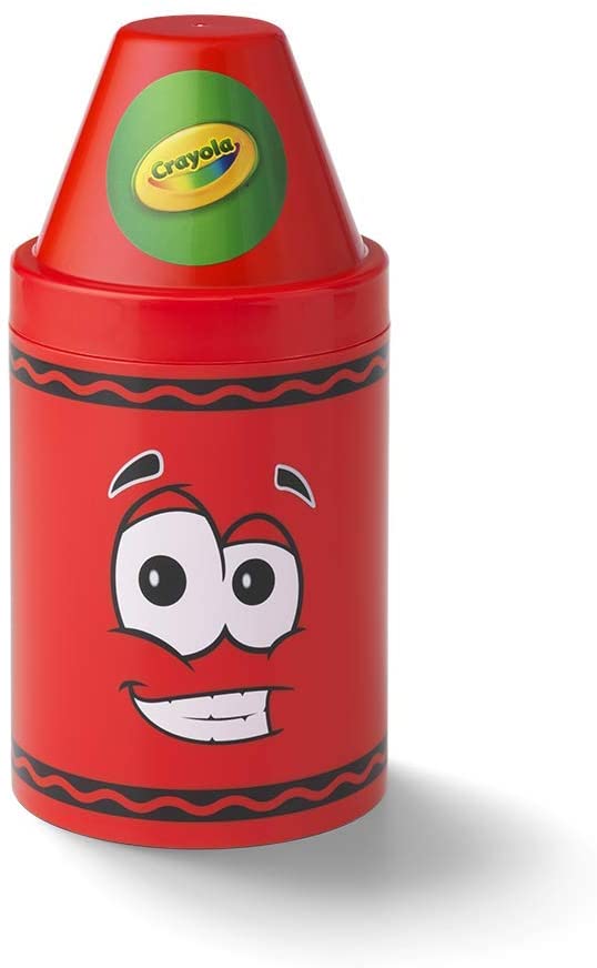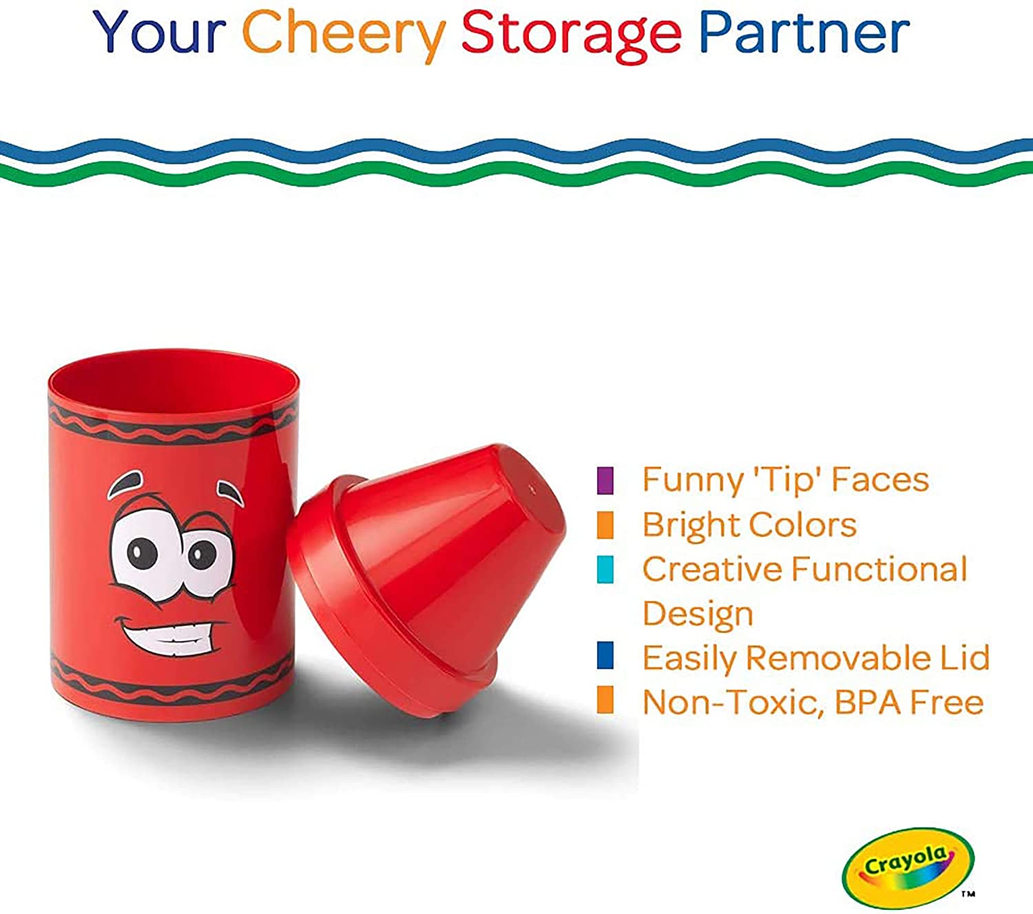 The Crayola Storage Tips are part of a product range inspired by the iconic Crayola Crayons. The lid/tip is easy removable making the storage container perfect for children toys, drawing tools and keepsakers. The storage tips are availiable in a range of crayon colours and Tip character designs making them a fun and practical feature in the children's room. This Storage Tip set includes one Crayola Storage Tip Large and one Crayola Storage Tip Small in classic Crayola colors- cerulean and red.