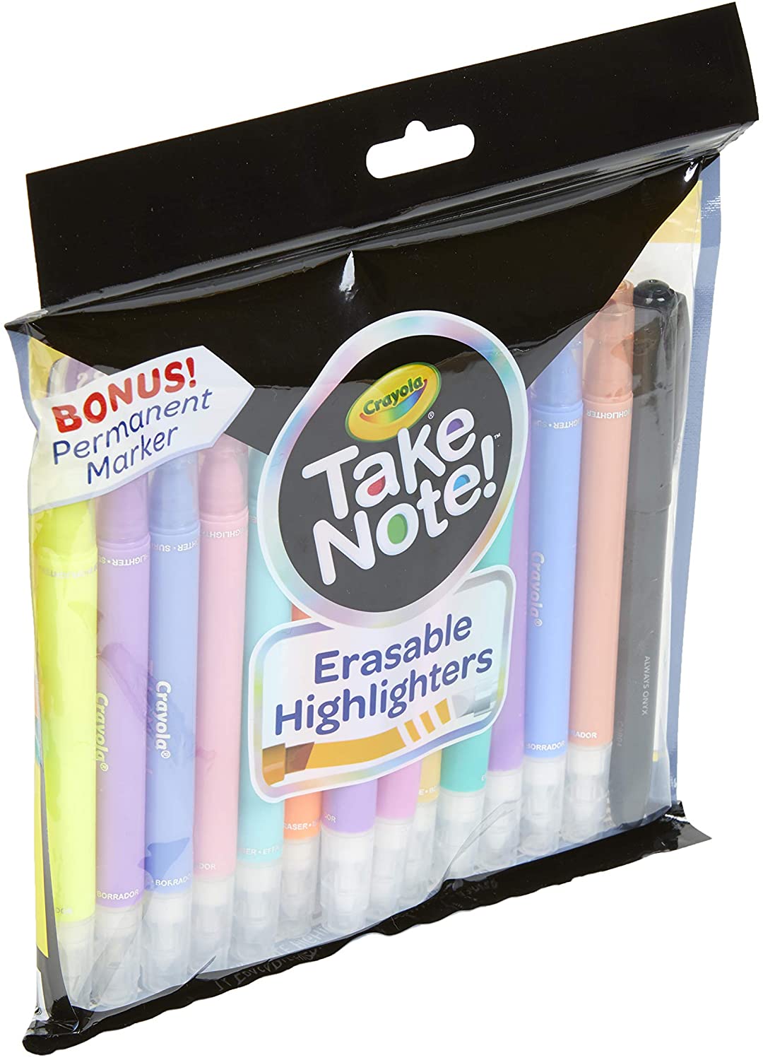 The Crayola Take note erasable highlighters in this set are designed to highlight and erase in 14 vibrant colors without damaging books or documents! Each of these erasable highlighters have bright colors on one end, with clear ink tips on the other end, for magically erasing the colorful highlights. It's the perfect set for school, home, of office, with the special bonus Crayola permanent marker included. Colorfully organize your notes with highlighters that are forgiving of mistakes, and allow you to create fun designs. When you're looking for something a bit more permanent, you can rely on the Onyx black permanent marker to make a bold statement on a variety of surfaces.
