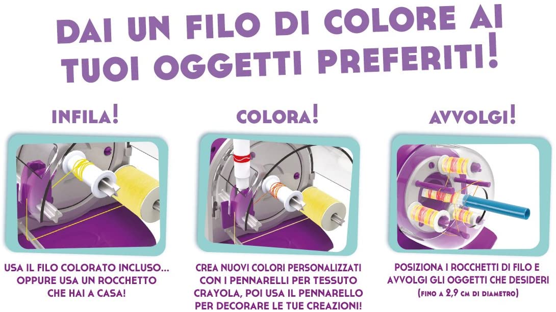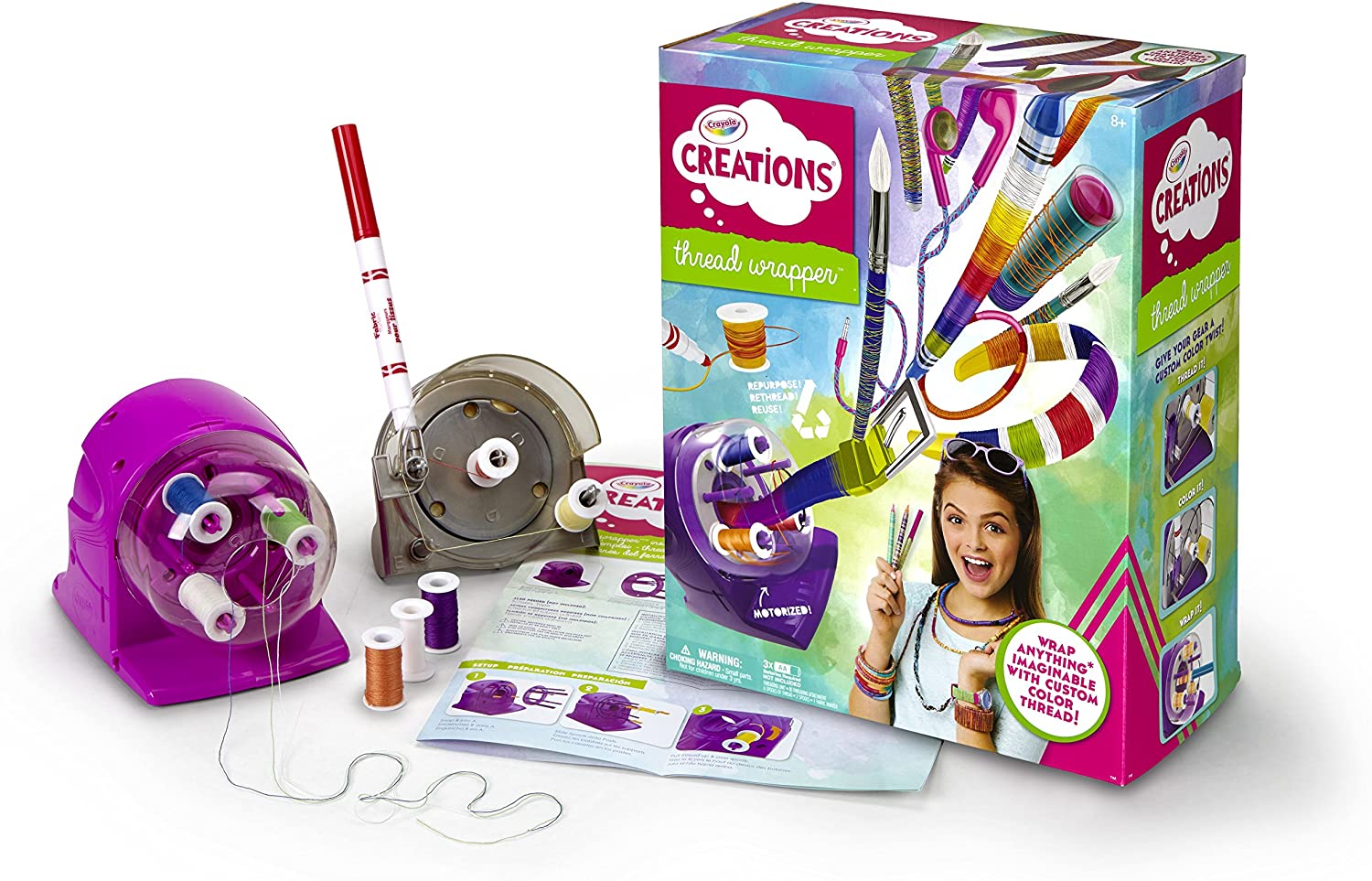 - Contents: 1 motorized threading unit, 1 re-threading attachment, 6 Crayola color spools of thread, 2 empty spools and 1 Fineline fabric marker