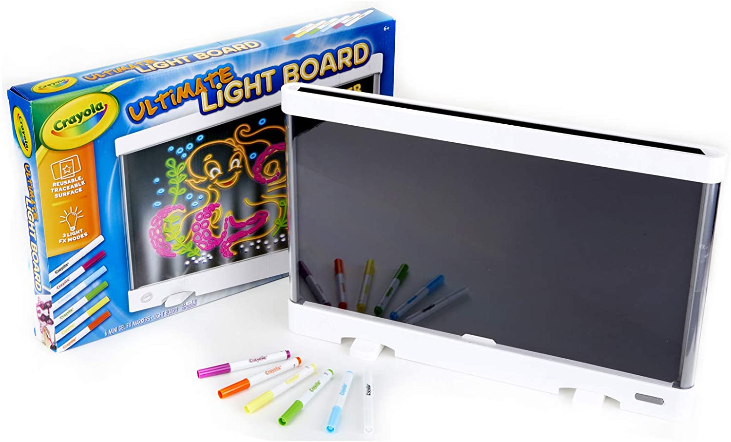 - CRAYOLA ULTIMATE LIGHT BOARD: Features Crayola Light Up Drawing Tablet with 6 Mini Washable Gel FX Markers.