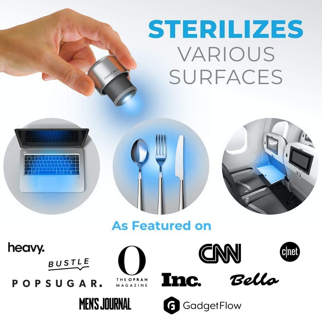 In addition to sanitizing water, CrazyCap eliminates germs from the cap and bottle itself so they remain clean, fresh and odorless with no soap or scrubbing needed. To top it off, it can also be used on any contaminated surface, destroying germs on a shared workspace, tablet, cellphone, toothbrush, camera, cutlery or desk computer. You can expose up to 100 square inches of the surface throughout the Crazy mode (2-minute duration time). A typical distance of exposure from the surface is 4 inches.