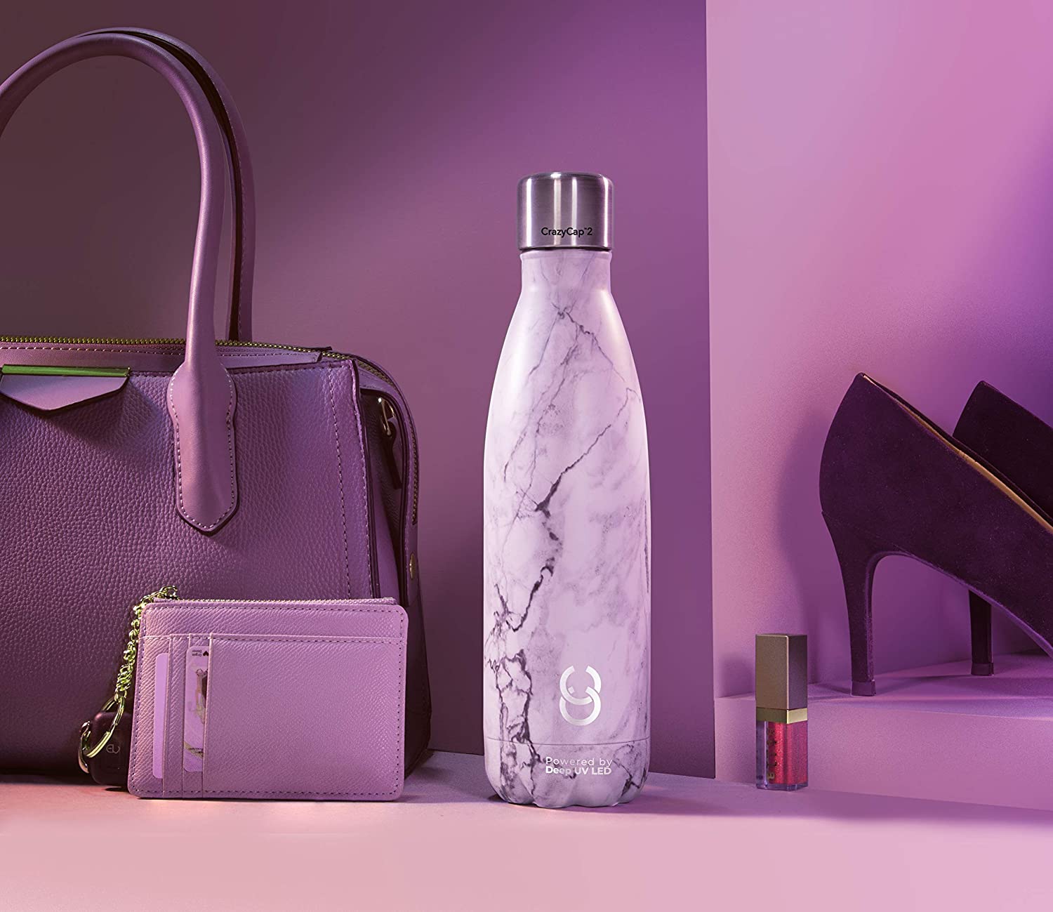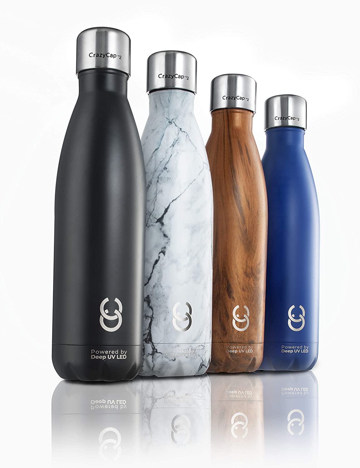 Made with FDA-compliant, food-grade materials, the CrazyCap Bottle – available in black, cyan, white or blush – is crafted of 304 stainless steel with vacuum, double-walled construction to keep your drink cold for 24 hours or hot for 12 hours. Also made of stainless steel, the CrazyCap features a high-grade quartz lens with a built-in LED (10-year lifespan). It’s outfitted with a leakproof silicone gasket to ensure a 360-degree water seal, and uses a filterless design which requires zero maintenance. An extra gasket, cleaning wipes and user's manual are also included for your convenience.