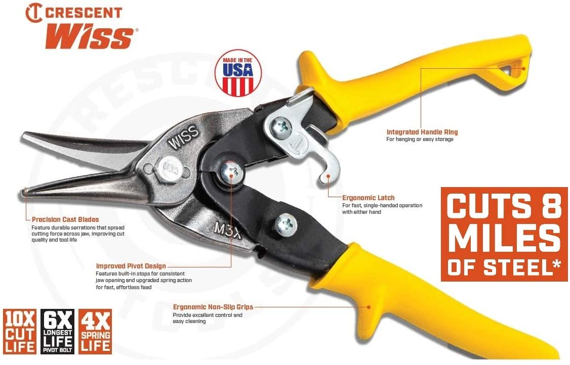 Crescent Wises has taken the aviation snip to the next level with the advanced metal Master aviation snips. The precision cast molybdenum blades have conk ground Serrations which allow for more uniform Serrations that provide a cleaner cut every time. They feature extended pivot bolt life due to the superior free float design. The spring action design allows for fast, effortless feed. The all new latch design provides ergonomic single handed operation for left or right handed users. New extended non slip handle grips give users better control while cutting. The new generation of Crescent Wises metal Master will cut over 8 miles of steel and feature up to 10 times longer cut life than traditional aviation snips. They are available in left/straight cut, Right/straight cut, and straight cut.