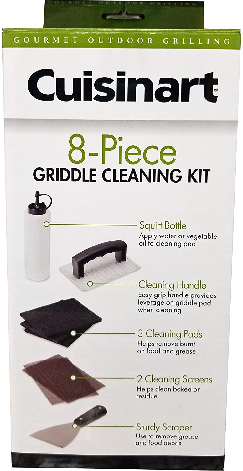 The Cuisinart 8 Piece Griddle Cleaning Kit provides you with the tools you need to get a deep clean on your griddle cooking surface. Use the scraper to remove grease and food debris from the top of your griddle. Then squirt water over the top using the squirt bottle. Use the cleaning handle to keep the cleaning pad and screen in place while you move them all over the griddle top to get a deep clean. When it is thoroughly cleaned, add a little vegetable oil to the top to season it. Your griddle is now ready for the next use, enjoy! Sturdy Scraper use to remove grease and food debris Cleaning Handle easy grip provides leverage on griddle pad when cleaning 3 Cleaning Pads helps to remove burnt on food and grease 2 Cleaning Screens for easy removal of baked on residue Squirt Bottle to apply water or vegetable oil to cleaning pad