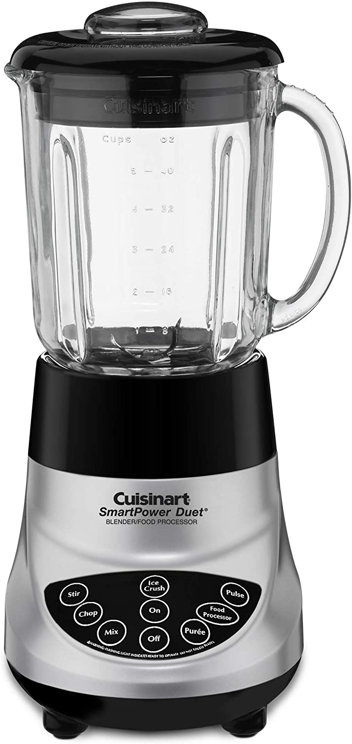 Cuisinart powerful new 7-Speed blender also has a genuine Cuisinart food Processor. A heavy-duty 500-watt motor pulses, stirs, mixes, purees, chops and even crushes ice in record time. In food Processor mode, users can slice, shred or process ingredients right into a 3-Cup work bowl. It's big, it's powerful and it's easy - removable parts are dishwasher-safe! Features: Full-power 500-watt motor with overload protection|Die-cast metal housing|48-ounce glass blender jar with premium ultra-sharp stainless steel blade assembly|3 cup food processor attachment with feed tube and pusher slicing/shredding disc and stainless steel chopping blade|7-speed electronic touchpad controls with LED indicators|Removable 2-ounce measuring cap on blender jar lid|Recipe book|Limited 3-year warranty|BPA free