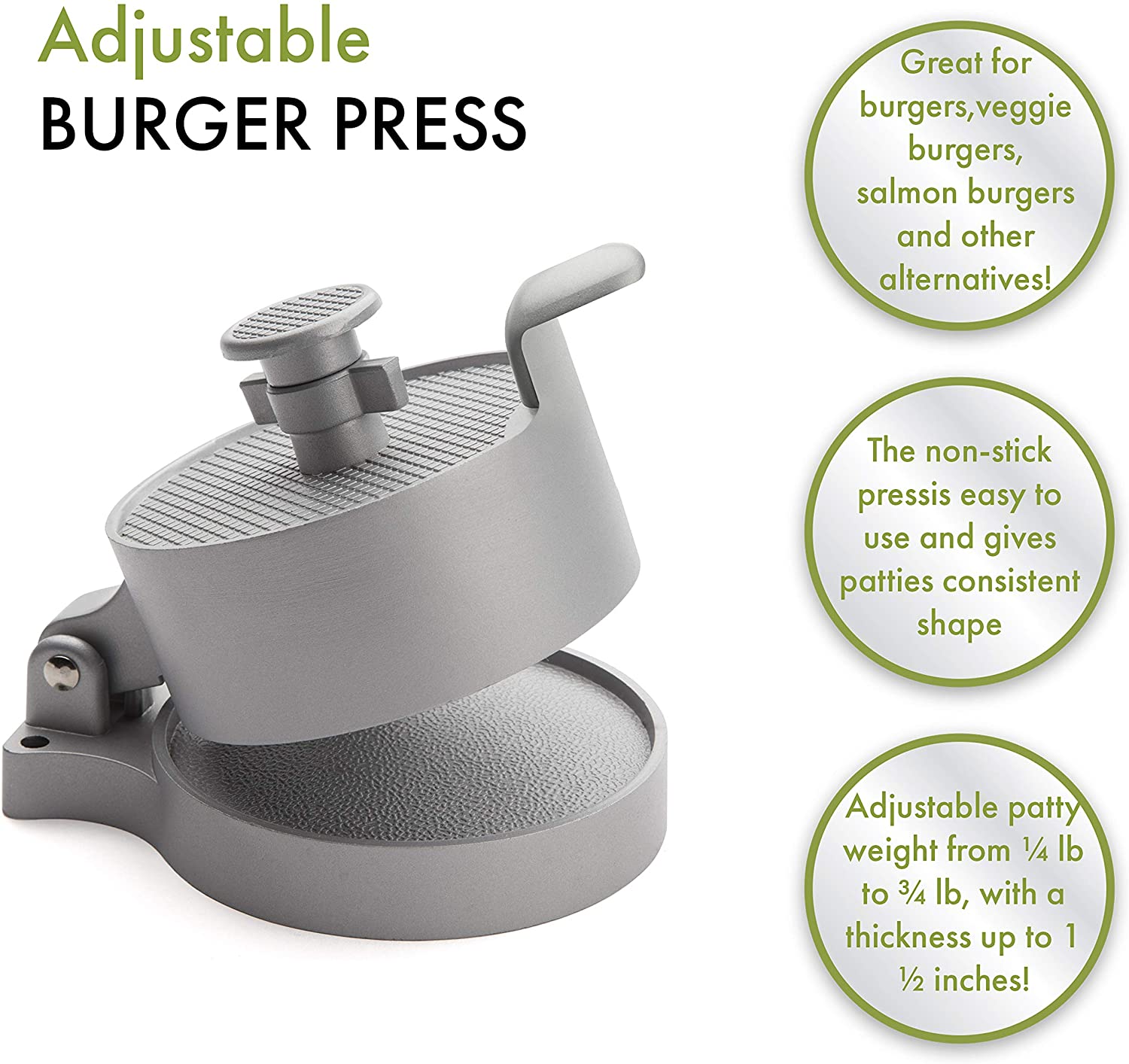 Adjust the thickness to your liking with the Cuisinart adjustable burger press! add your ground meat & press down to make a perfectly packed burger patty. Turn the dial to adjust the thickness of your burger! 1/4 lb burger, 1/3 lb burger, & 1/2 lb burger. Its durable Cast Aluminum material is non-stick & easy to clean. Line with Wax paper or plastic wrap for an easy transition from creating your burgers to placing them on the grill or in the freezer for later enjoyment.
