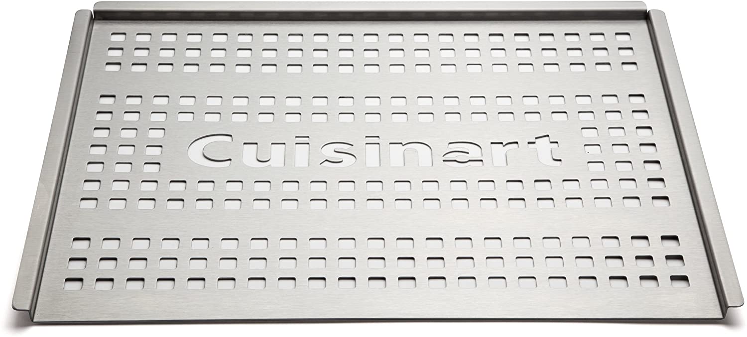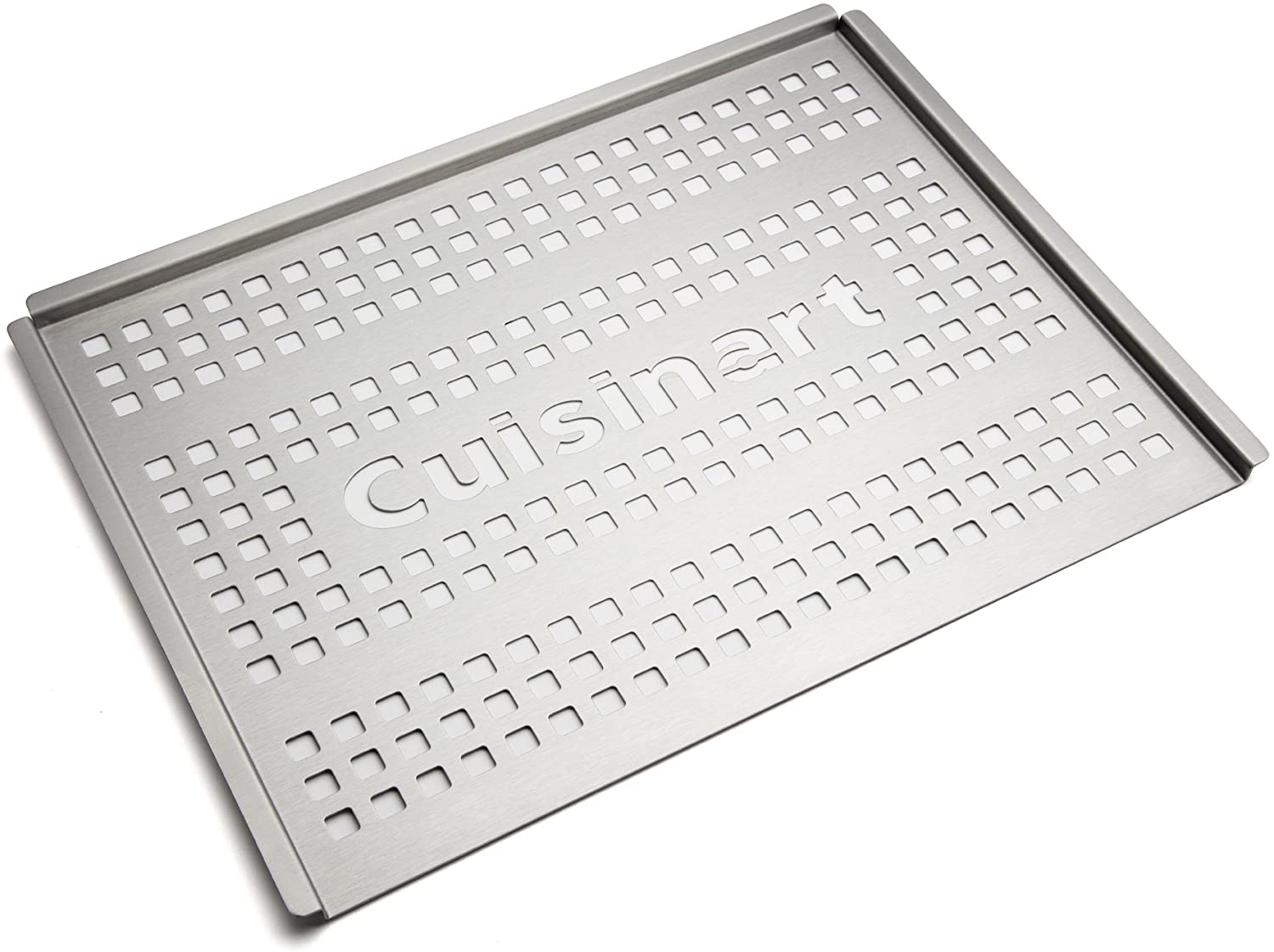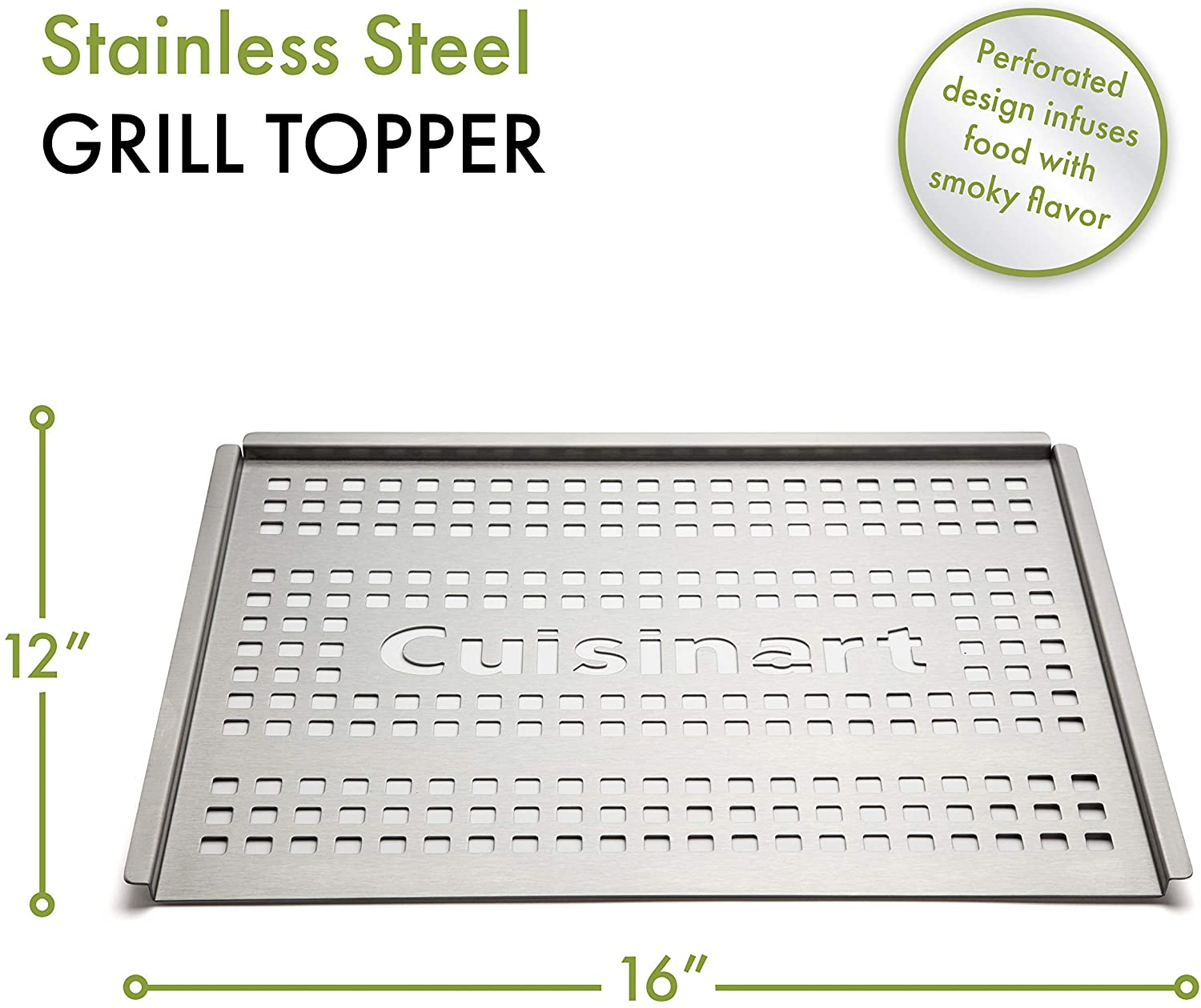 The Cuisinart stainless steel 12" x 16" grill Topper helps any grilling enthusiast cook a variety of delicate foods on the grill without allowing them to fall through the grate. Ideal for fish, seafood & vegetables, this smartly designed platter features a large 12" x 16" grilling surface & a perforated grilling surface to enhance the natural grilled flavors created by the open flame. Features: Ideal for grilling delicate foods that may stick to or fall through grill grates|Perforated grilling surface enhances natural flavors|Durable stainless steel material