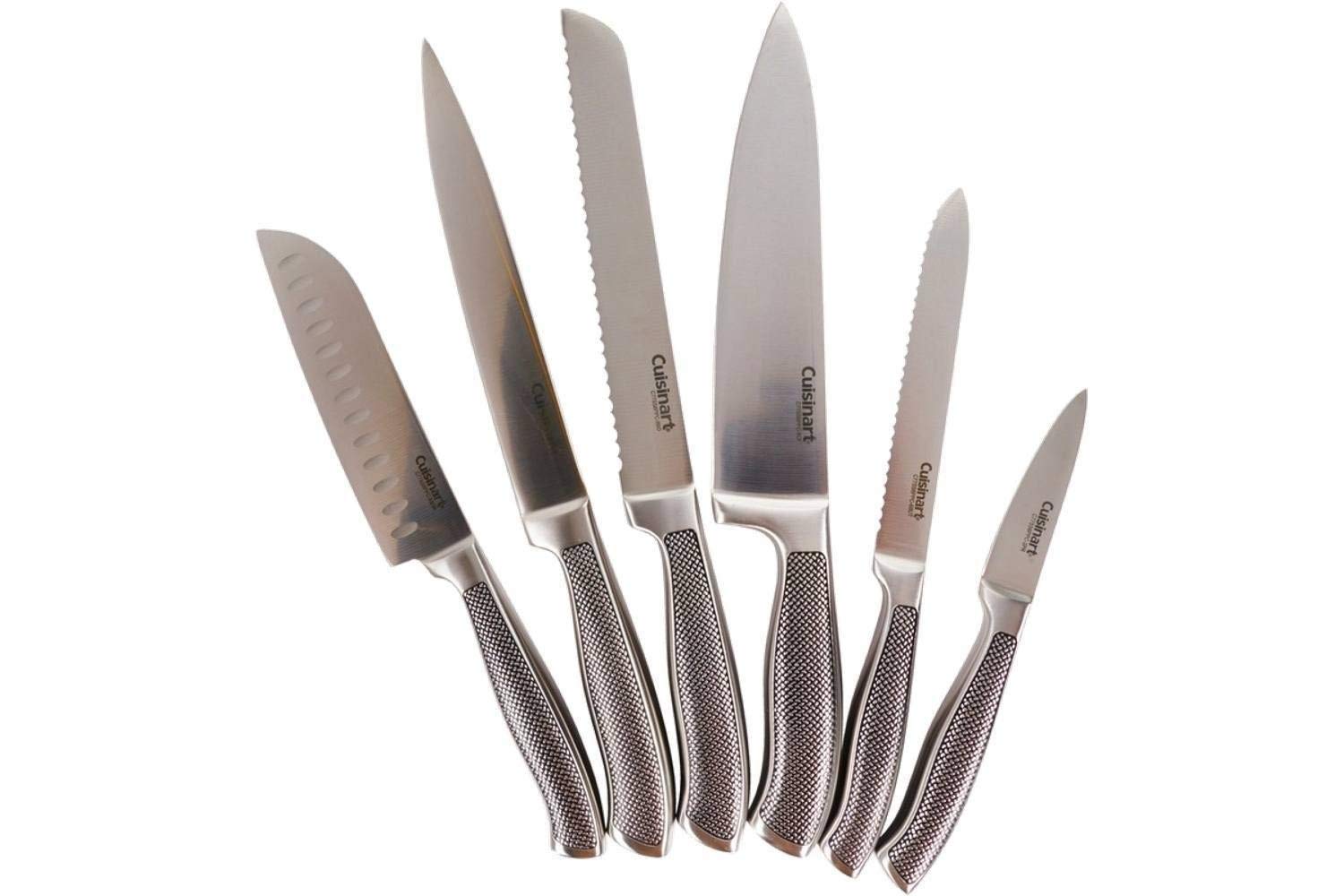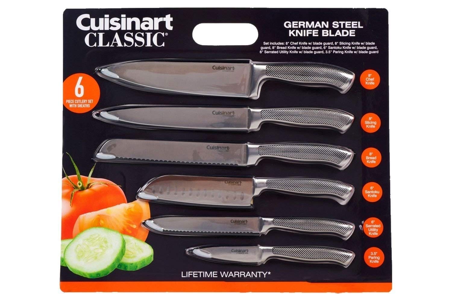 - SET INCLUDES: 8" Chef Knife with blade guard, 8" Slicing Knife with blade guard, 8" Bread Knife with blade guard, 6" Santoku Knife with blade guard, 6" Serrated Utility Knife with blade guard and 3.5" Paring Knife with blade guard