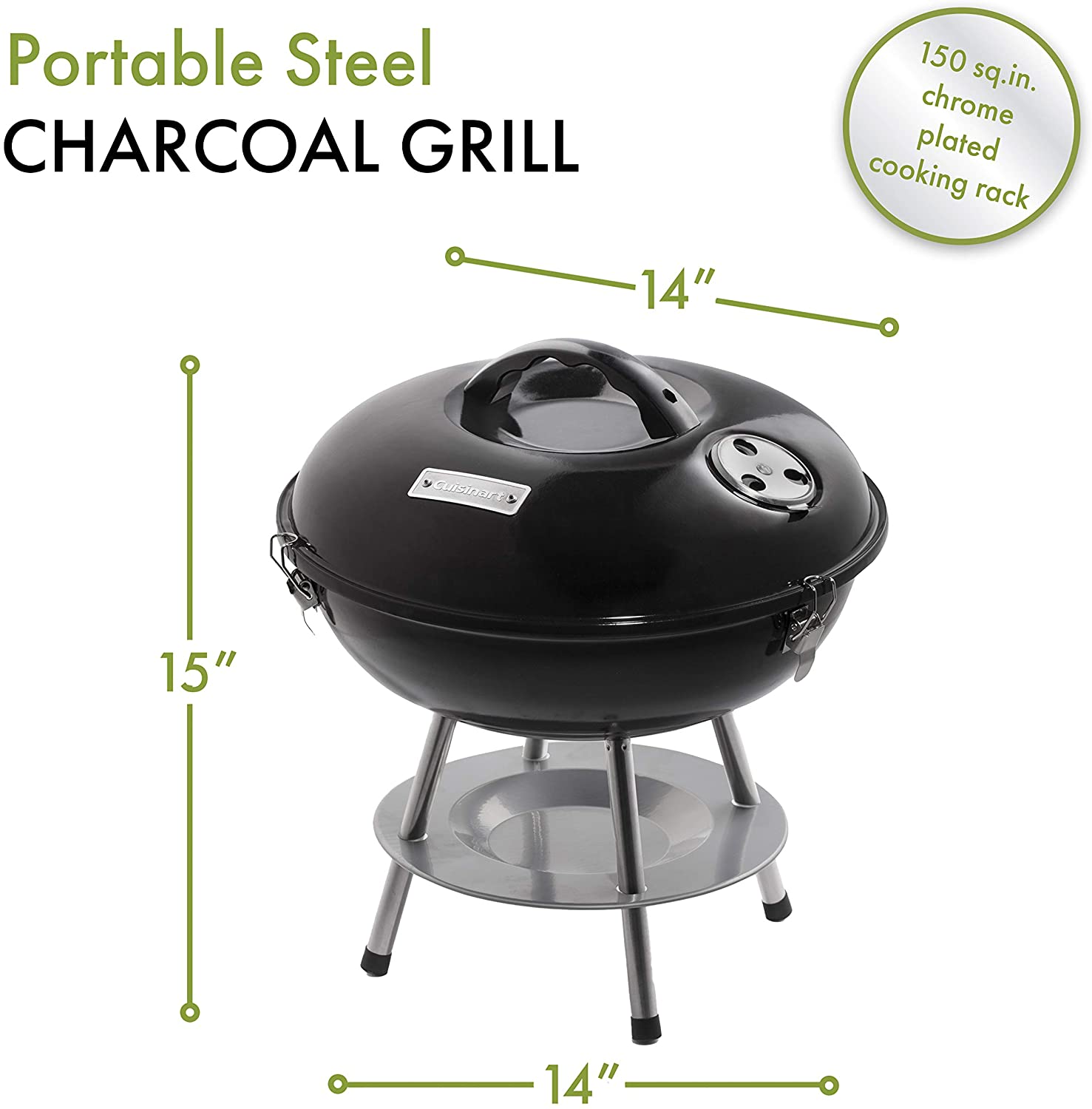 The Cuisinart 14" Portable Charcoal grill offers the perfect solution for all your on-the-go grilling needs. This compact little grill is lightweight & easy to transport but still offers over 150 square" Of grilling space - enough to grill for the entire family or the carload at the big game. The firebox is enamel coated - giving it strength & durability to survive the harshest grilling conditions. The dual venting system helps control the heat so you can cook slow & low or up at searing hot temperatures. For added convenience, the lid is secured by 3 durable locks, & the ash tray is accessible for easy clean-up.