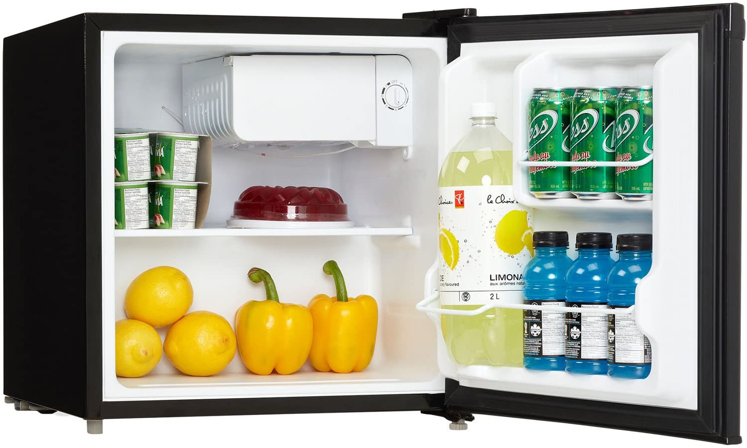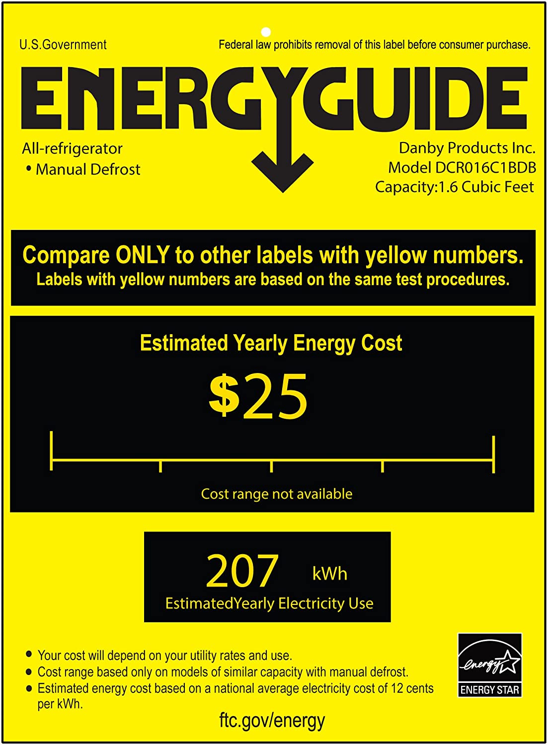 The Danby DCR016C1BDB Energy Star 1.6 Cu. Ft. Compact Refrigerator/Freezer, in black, is energy efficient refrigeration in a convenient, compact unit. Perfect for countertop use, this model makes a great addition to the student dorm room or small office. It includes a half-width freezer section, 1 wire shelf and door racks with tall bottle storage. With a reversible door hinge, an integrated door handle and a smooth-back design, this handy refrigerator/freezer will fit almost anywhere.
