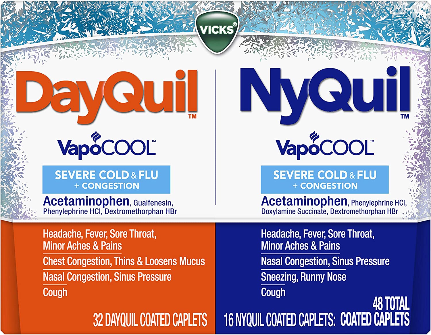 DayQuil and NyQuil SEVERE with Vicks VapoCOOL Cough, Cold & Flu Relief, 48 Caplets (32 Dayquil, 16 Nyquil) - Sore Throat, Fever, and Congestion Relief, Day or Night, (Packaging May Vary)