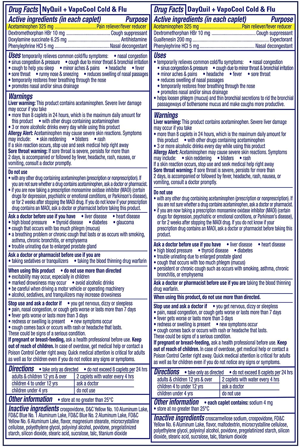 Vaporize your cold, day or night, with NyQuil and DayQuil SEVERE with Vicks VapoCOOL cough, cold & flu, multi-symptom caplets. Get Maximum Strength Nighttime Cold & Flu relief of NyQuil SEVERE with a soothing rush of Vicks Vapors helping to put your cold to bed. Plus, get Maximum Strength, Non-Drowsy Daytime Cold & Flu relief that ripples through your senses to help relieve minor aches & pains, fever, nasal congestion & sinus pressure, sneezing, and runny nose. Contains acetaminophen.
