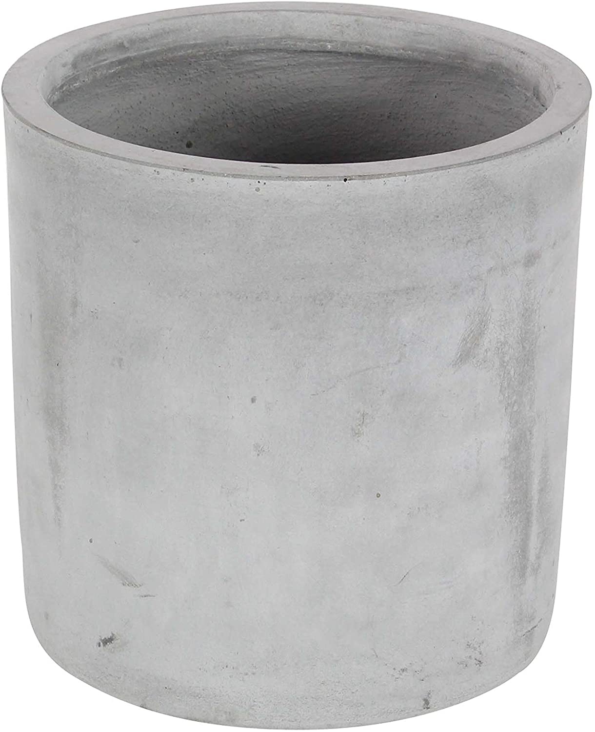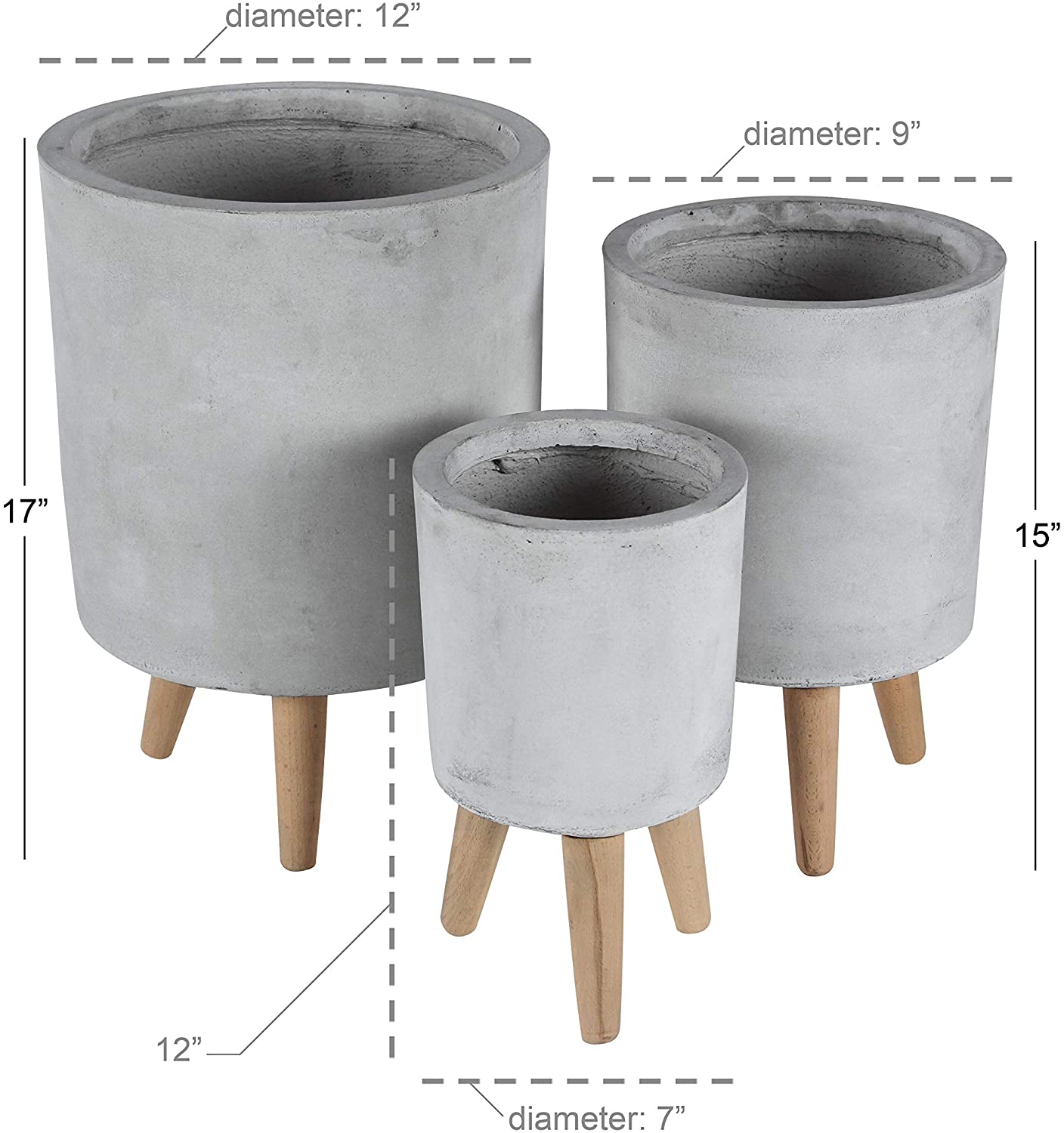 Set of Three 12" x 17" Rustic Reflections fiber clay planter, made of fiber-clay, fiber-glass and beech wood, distressed cylindrical grey planters, light brown legs with a matte finish